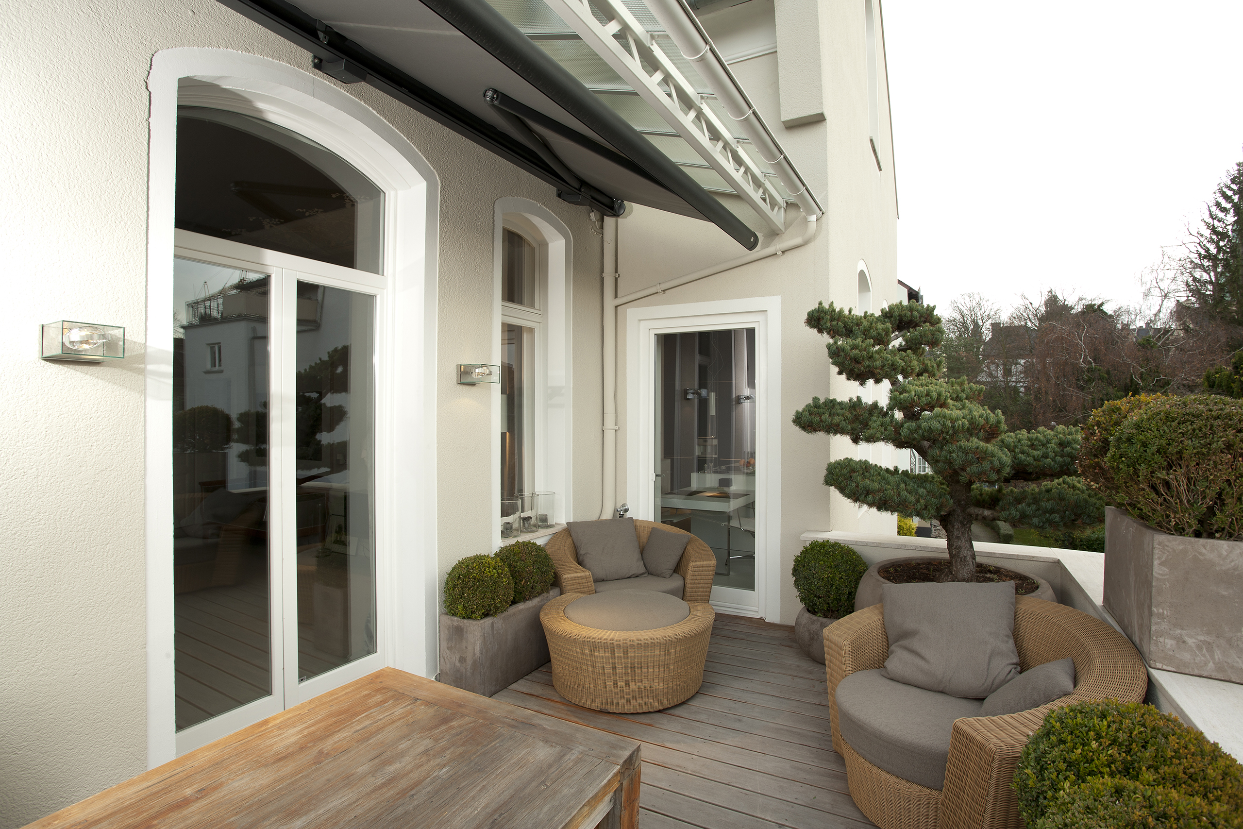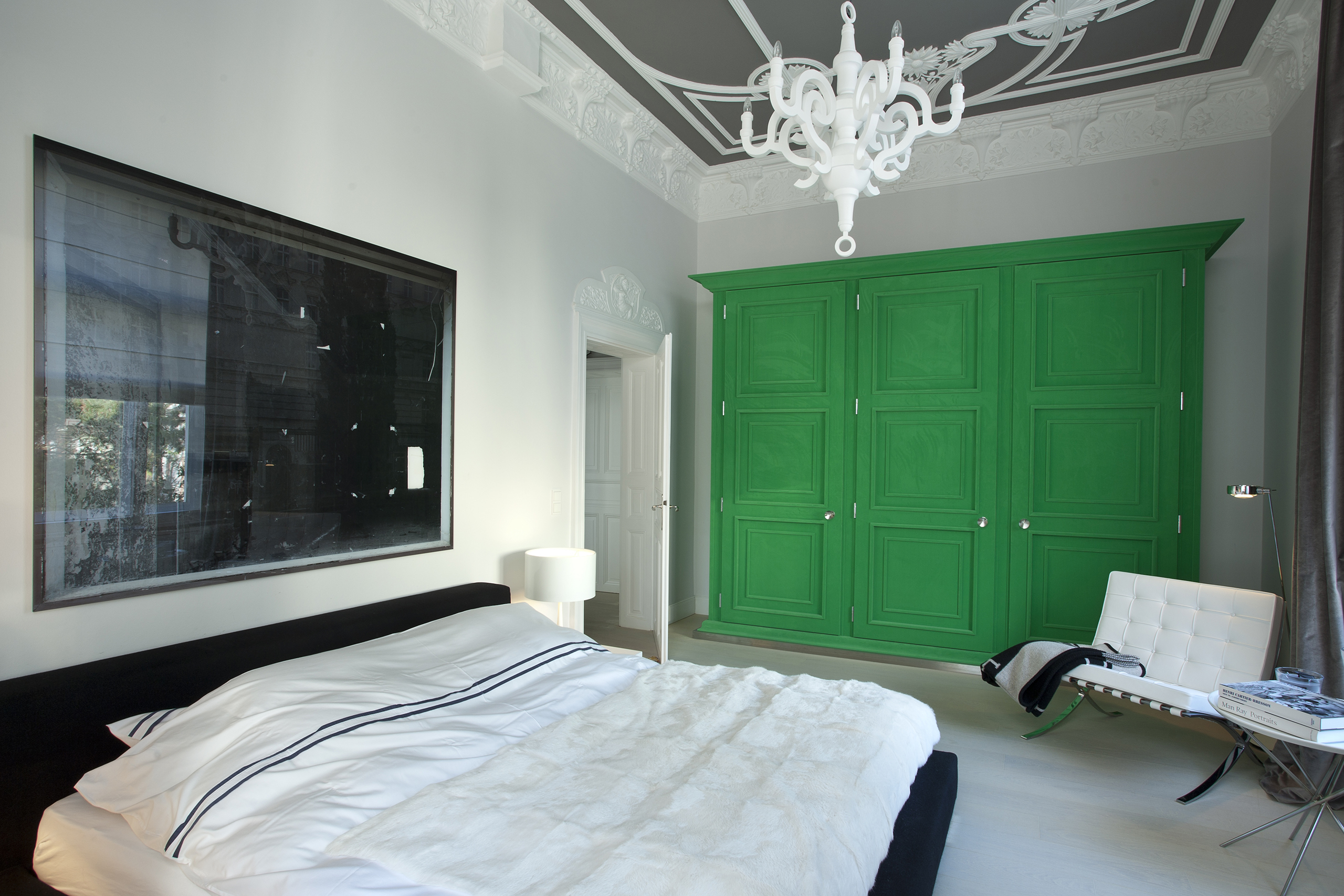 Wer sagt, dass Stuck immer Weiß auf Weiß daherkommen muss. Man kann die floralen Elemente auch auf sattem Grau inszenieren. Generell haben die Innenarchitektinnen von PurPur bei der Sanierung und Entkernung der Wiesbadener Altbauwohnung dem prachtvollen Altbestand großen Respekt gezollt. Und ihn mit Mut zum Mix neu in Szene gesetzt. Dabei werden die großen Räume zur Bühne für moderne Möbel-Arrangements von Knoll International, Minotti oder Interlübke. Dank des ausgeklügelte Farb-, Material- und Lichtkonzepts fügt sich alles in ein stimmiges Stillleben. Mit Rohseide gekleidete Fensterfronten vermitteln den Räumen Geborgenheit und verleihen ihnen Textur.