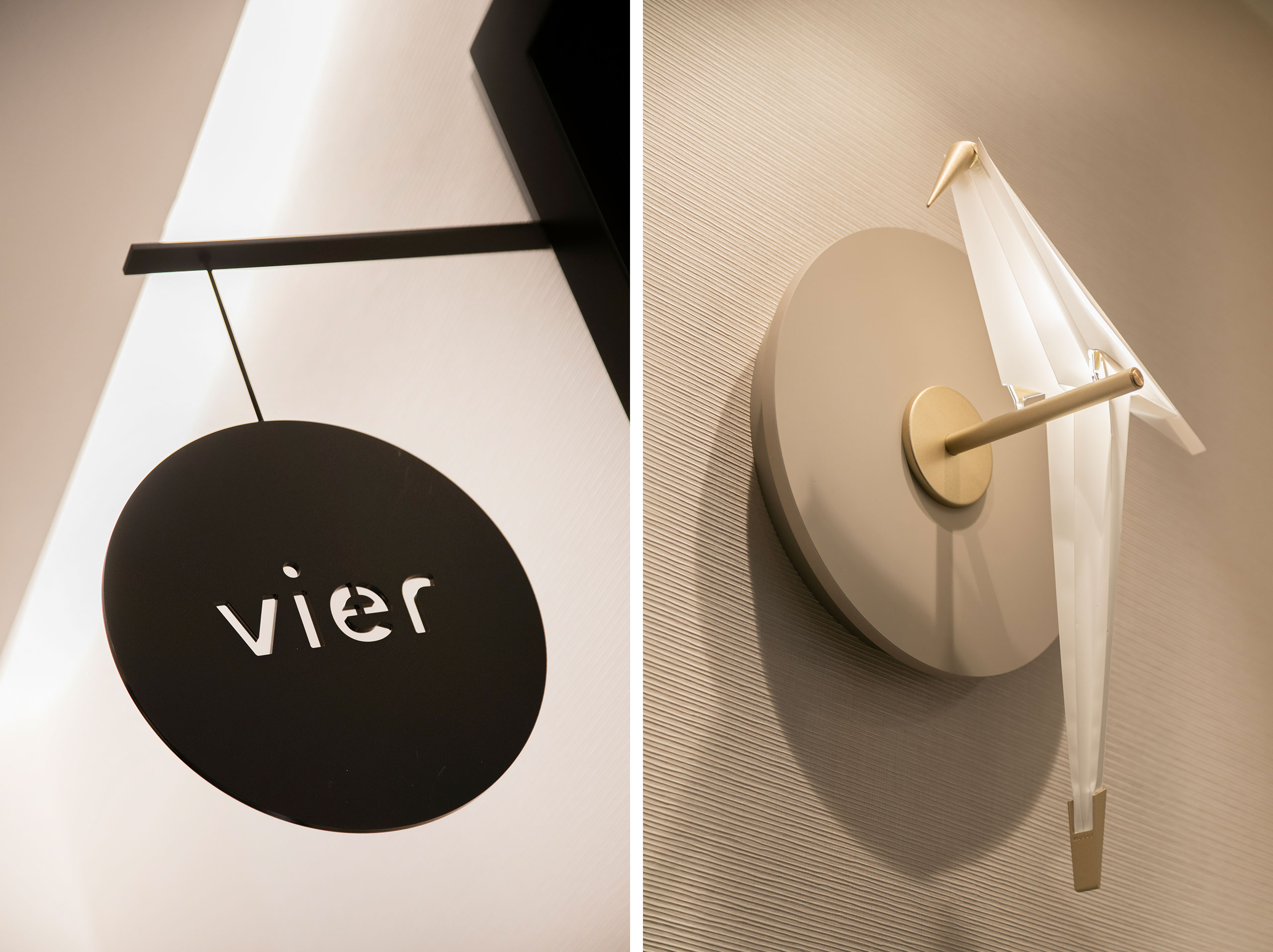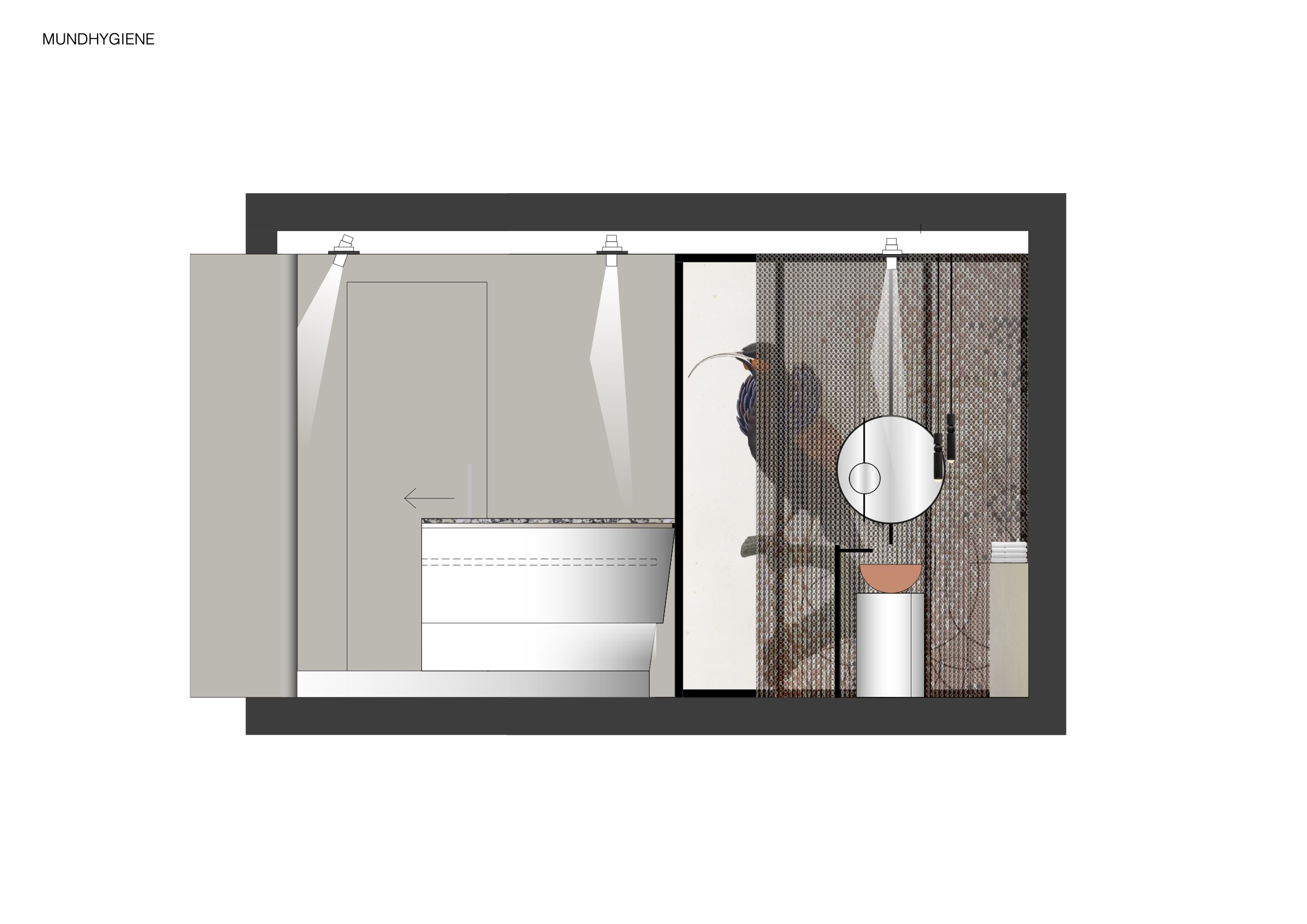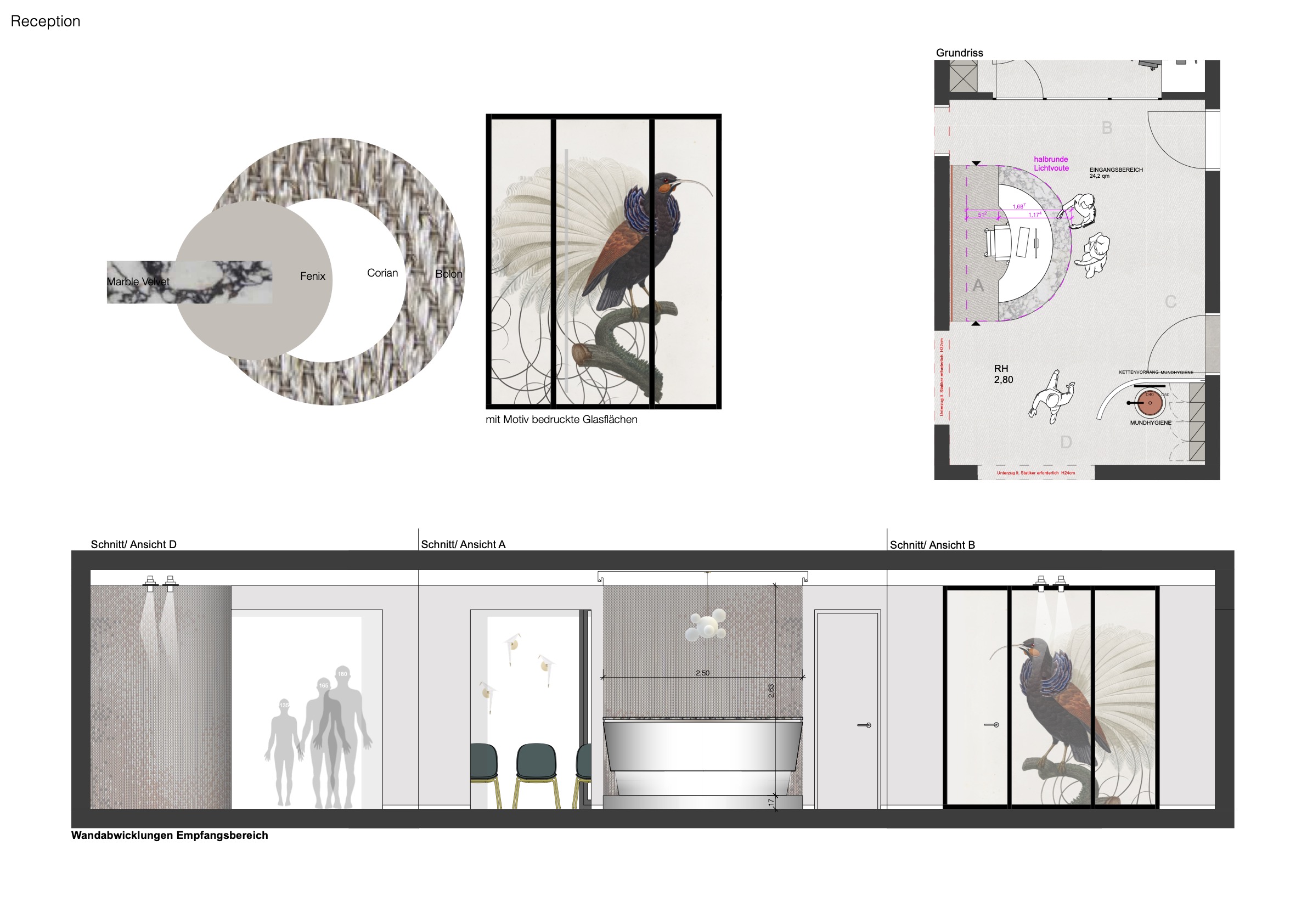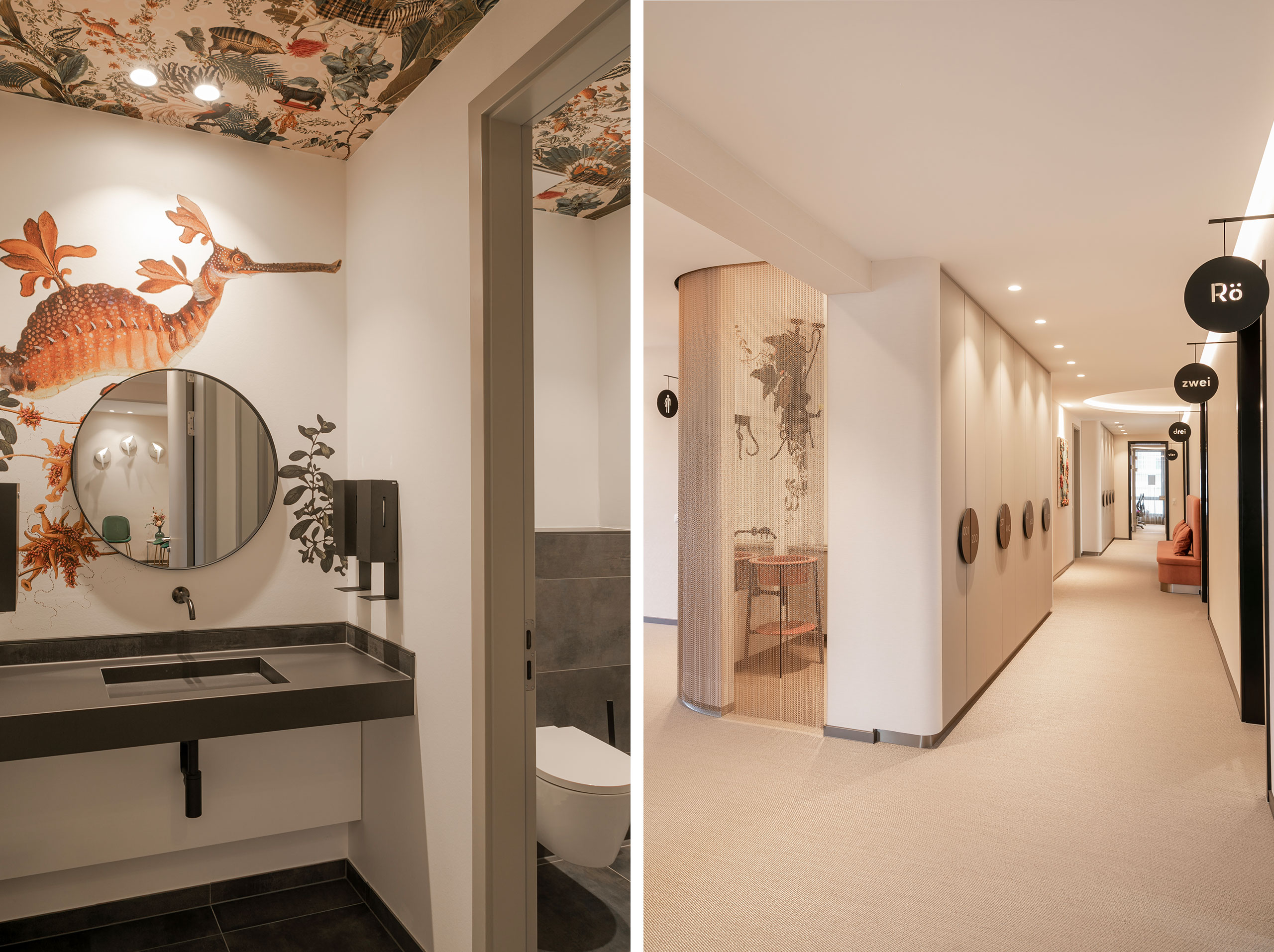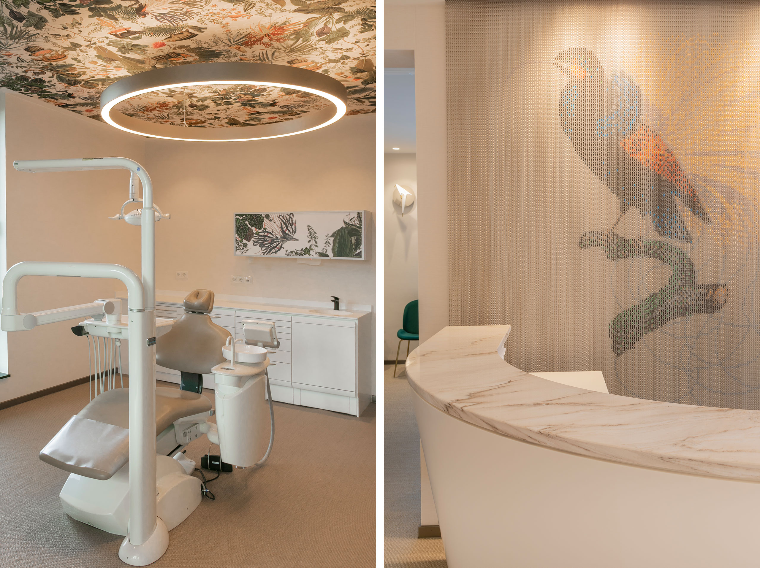 Ein besonders prägnantes Element ist der Empfangsbereich, der durch bedruckte Kettenvorhänge mit Motiven prähistorischer Vögel und Raubkatzen akzentuiert wird. Sanfte Beleuchtung und eine geschwungene Empfangstheke sorgen hier für ein harmonisches Zusammenspiel aus Ruhe und spielerischer Eleganz. Die Lichtgestaltung in der gesamten Praxis wurde präzise ausgearbeitet, um eine einladende und zugleich funktionale Atmosphäre zu schaffen, die alle Bereiche optimal ausleuchtet und in Szene setzt.