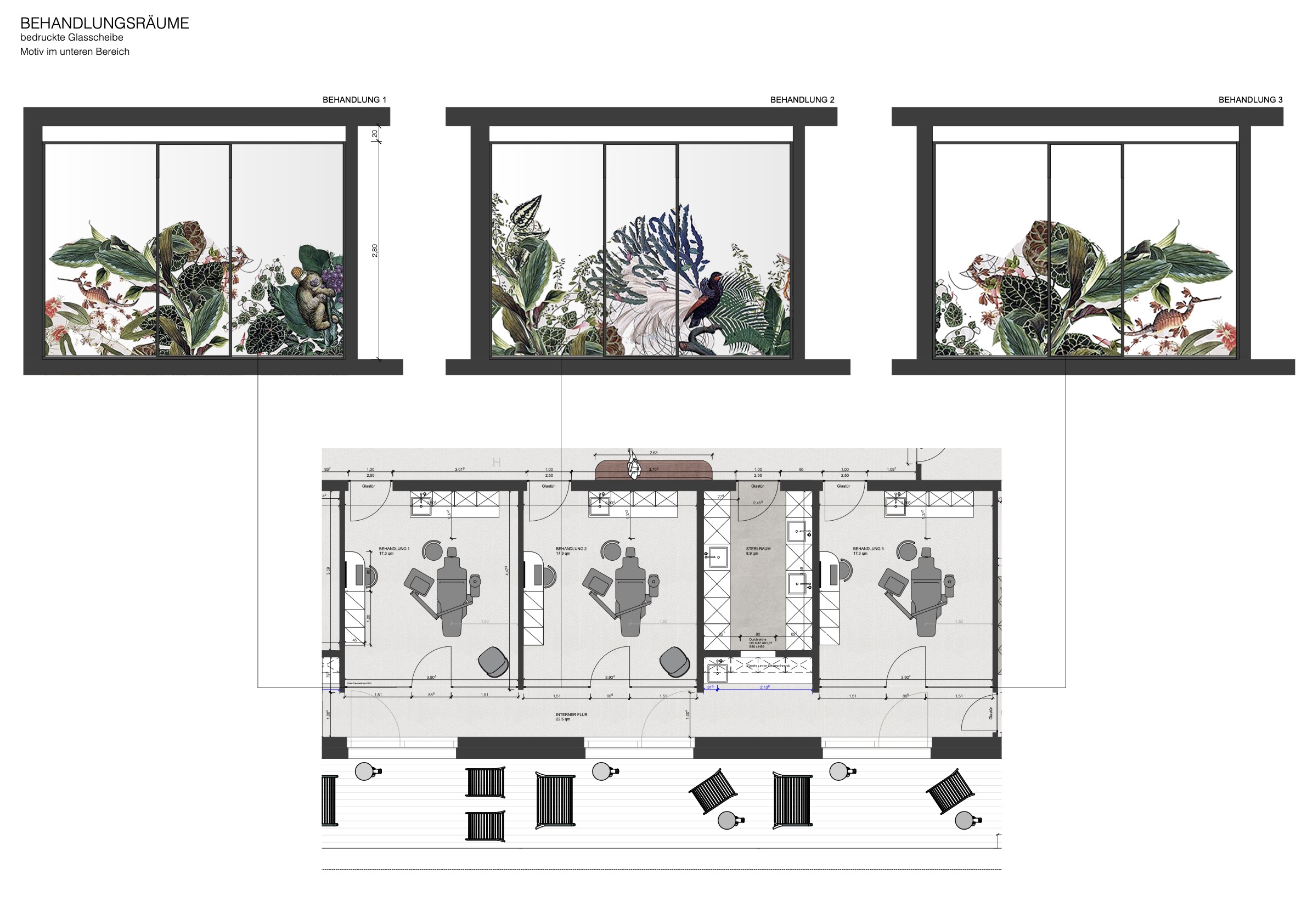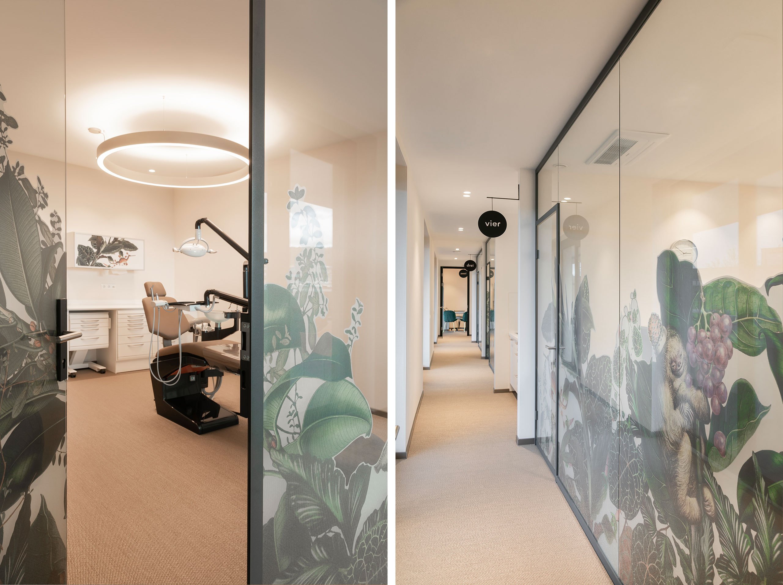 Das zentrale Thema des Designs sind ausgestorbene Tiere aus vergangenen Erdzeitaltern, die auf vielfältige Weise in den Räumen präsent sind. Bedruckte Kettenvorhänge mit eindrucksvollen Tiermotiven, tapezierte Decken, die eine spannende Aussicht bieten, und detailreich gestaltete Glastüren schaffen ein durchgängiges und stimmiges Konzept. Jede Ecke der Praxis erzählt eine eigene Geschichte und lädt dazu ein, in die Welt der Urzeit einzutauchen.