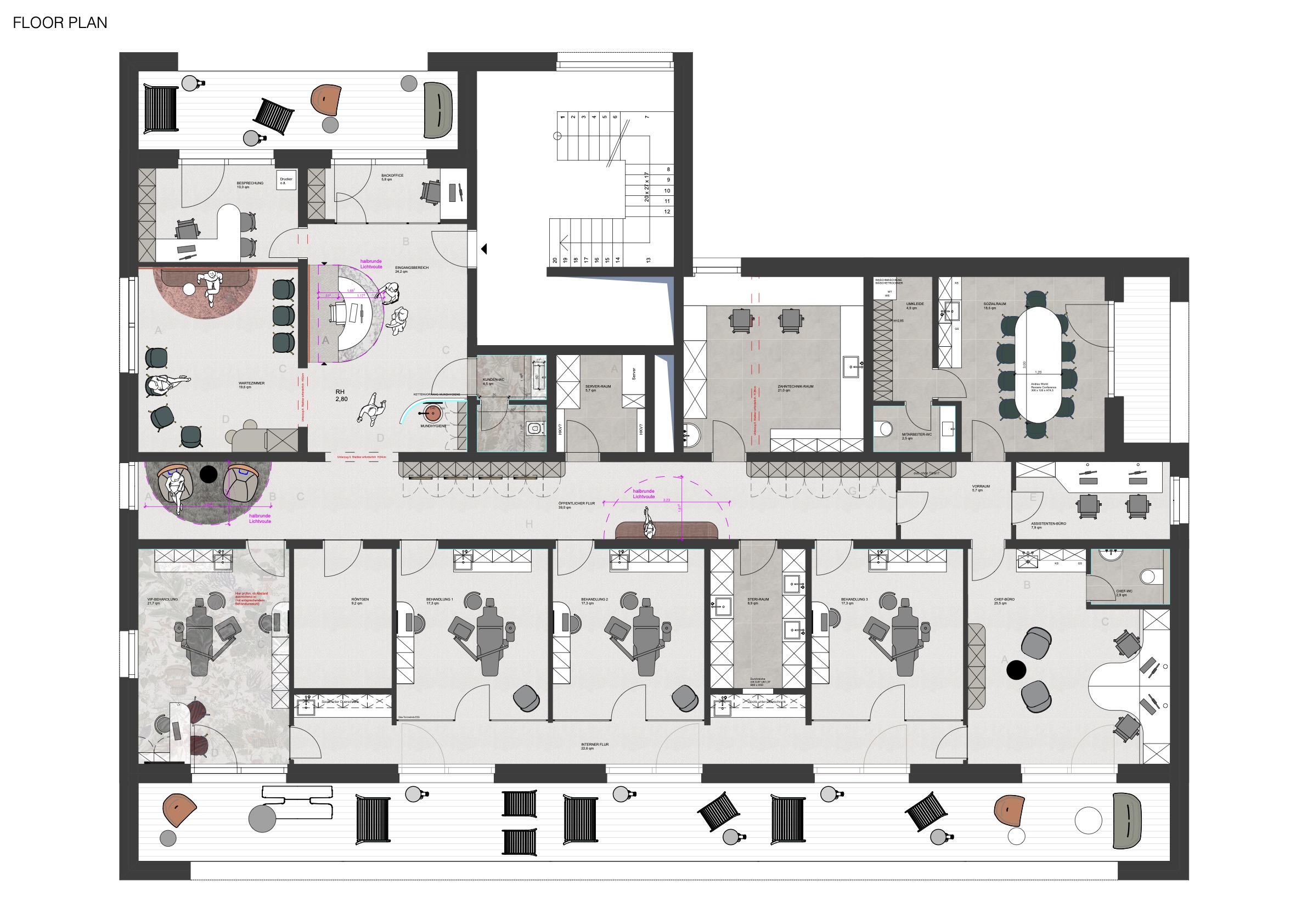 Ein weiterer, funktionaler Höhepunkt des Designs ist der zweite Flur für das Personal entlang der Außenfassade. Diese abgeschlossene Wegeführung ermöglicht es ÄrztInnen und MitarbeiterInnen, effizient zwischen den Behandlungszimmern zu wechseln, ohne den öffentlichen Bereich zu betreten. So bleibt die Praxis auch in arbeitsintensiven Momenten ruhig und strukturiert. Durch vollverglaste Wandflächen wird der Zugang von Tageslicht in die Behandlungszimmer dennoch gewährleistet und schafft ein angenehmes Arbeitsumfeld.
