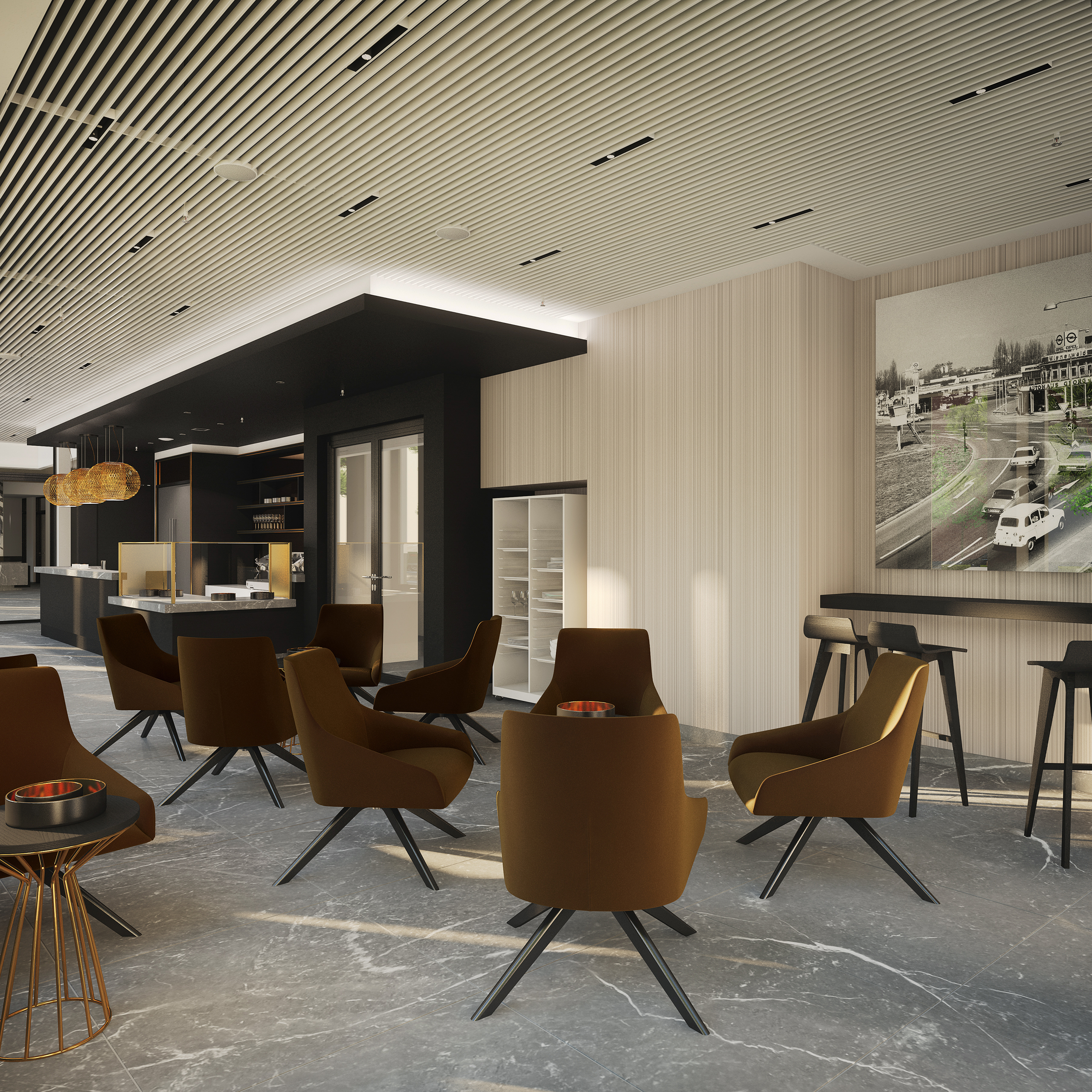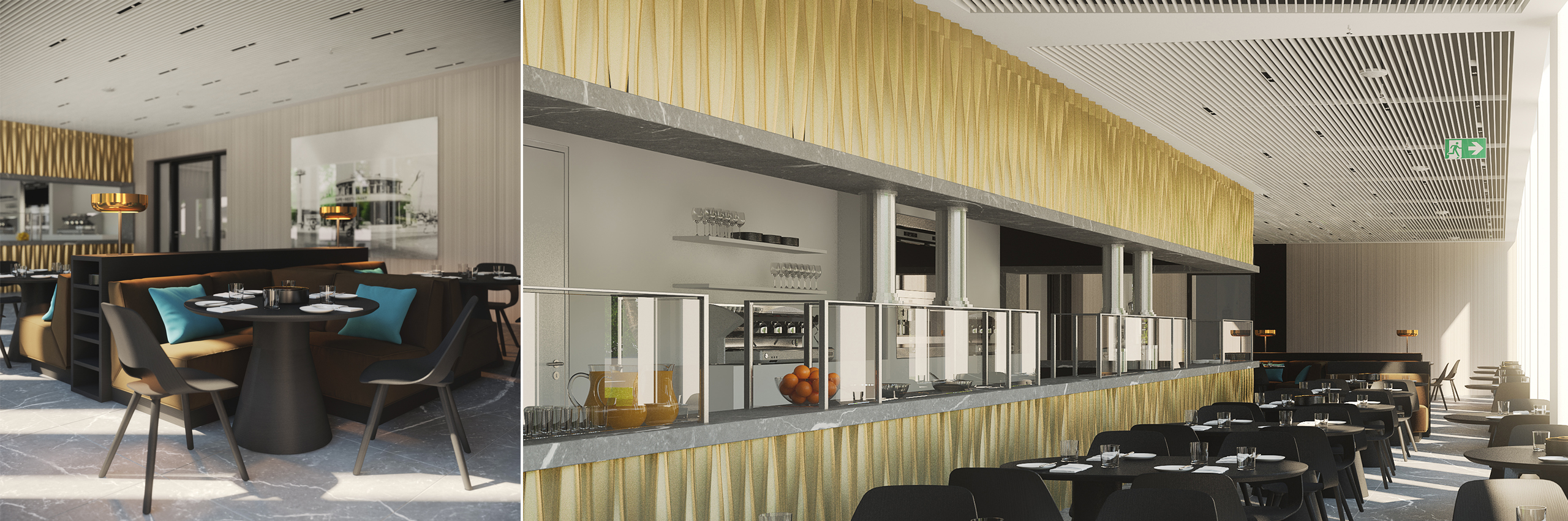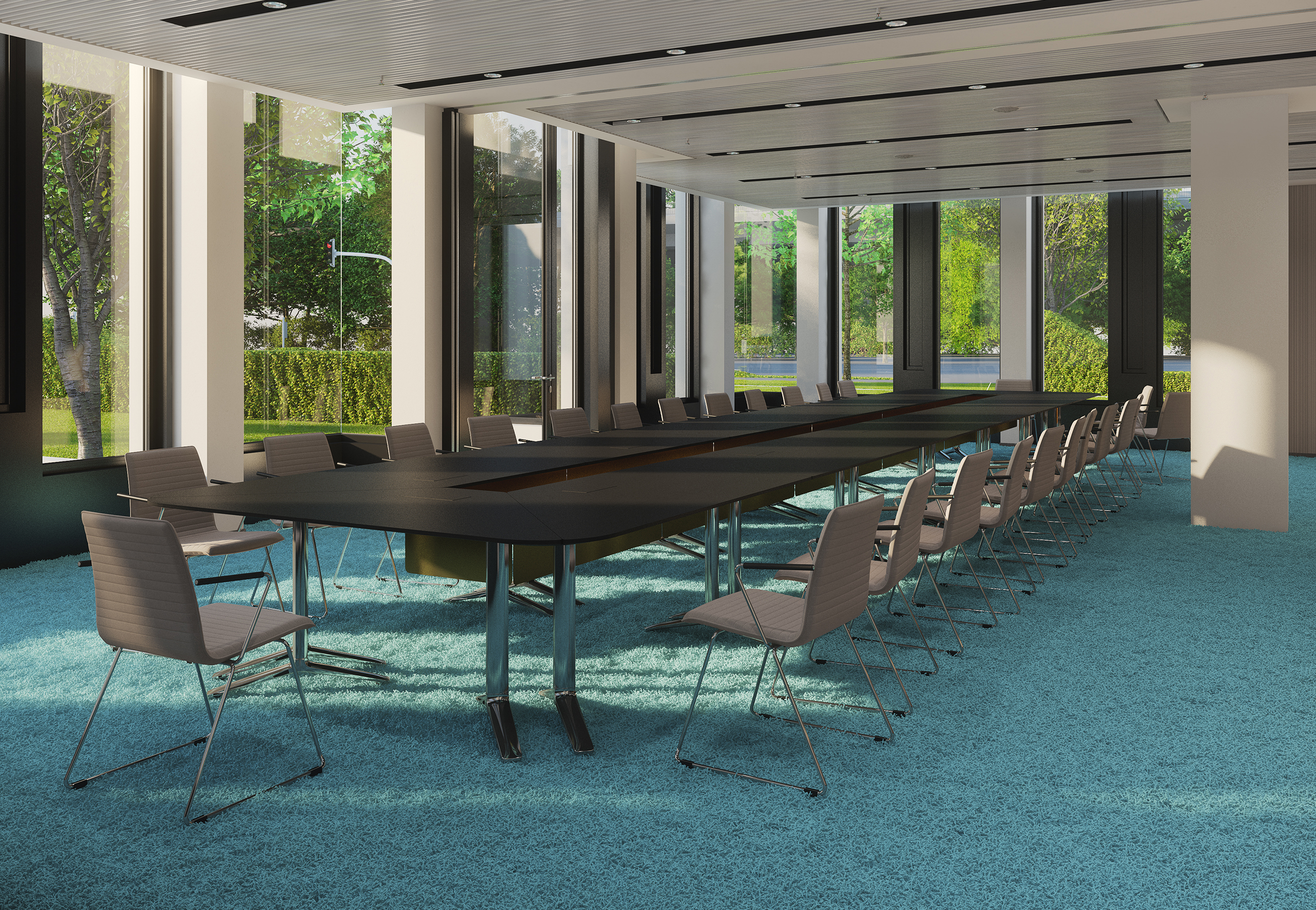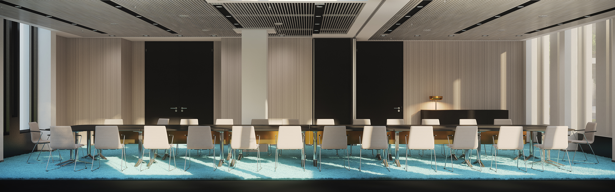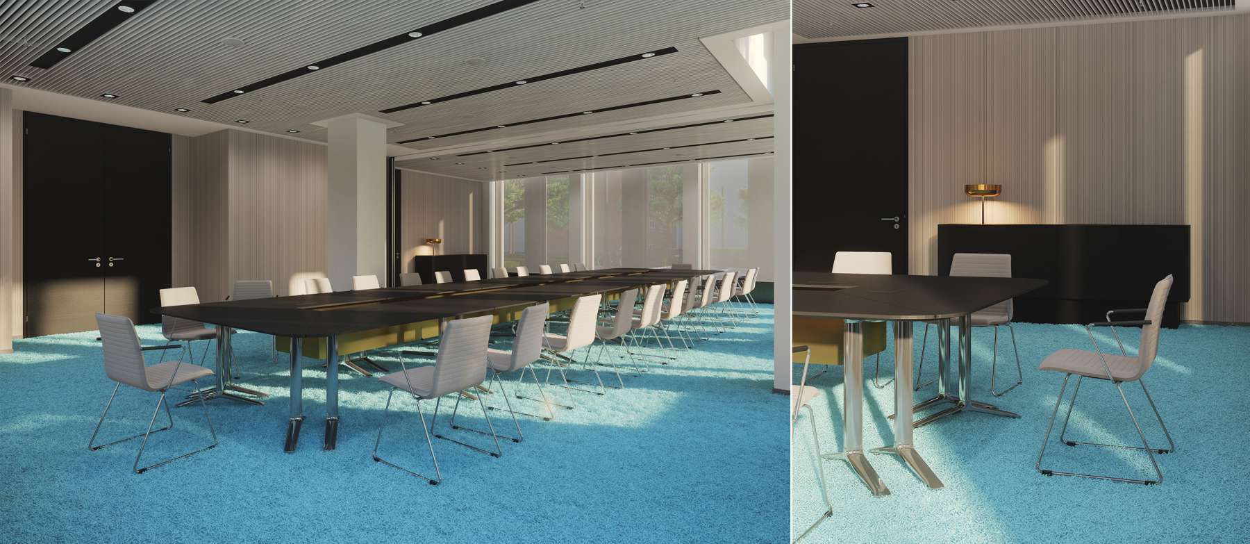 Vom eleganten Arrangement im Éntre über den weiß gemaserten Stein bis hin zur grafischen Wandgestaltung trägt er die souveräne Handschrift von PurPur. Gleiches gilt für Mitarbeitercasino und Cafeteria, wo die Einrichtung augenzwinkernd den Stil der 1960er Jahre zitiert. Azurblaue Accessoires in den Sitzgruppen kündigen dezent an, was im Konferenzbereich zum farbstarken Statement wird. Der hochflorige Teppichboden steht dabei im selbstbewussten Kontrast zur schlicht-schönen Möblierung.