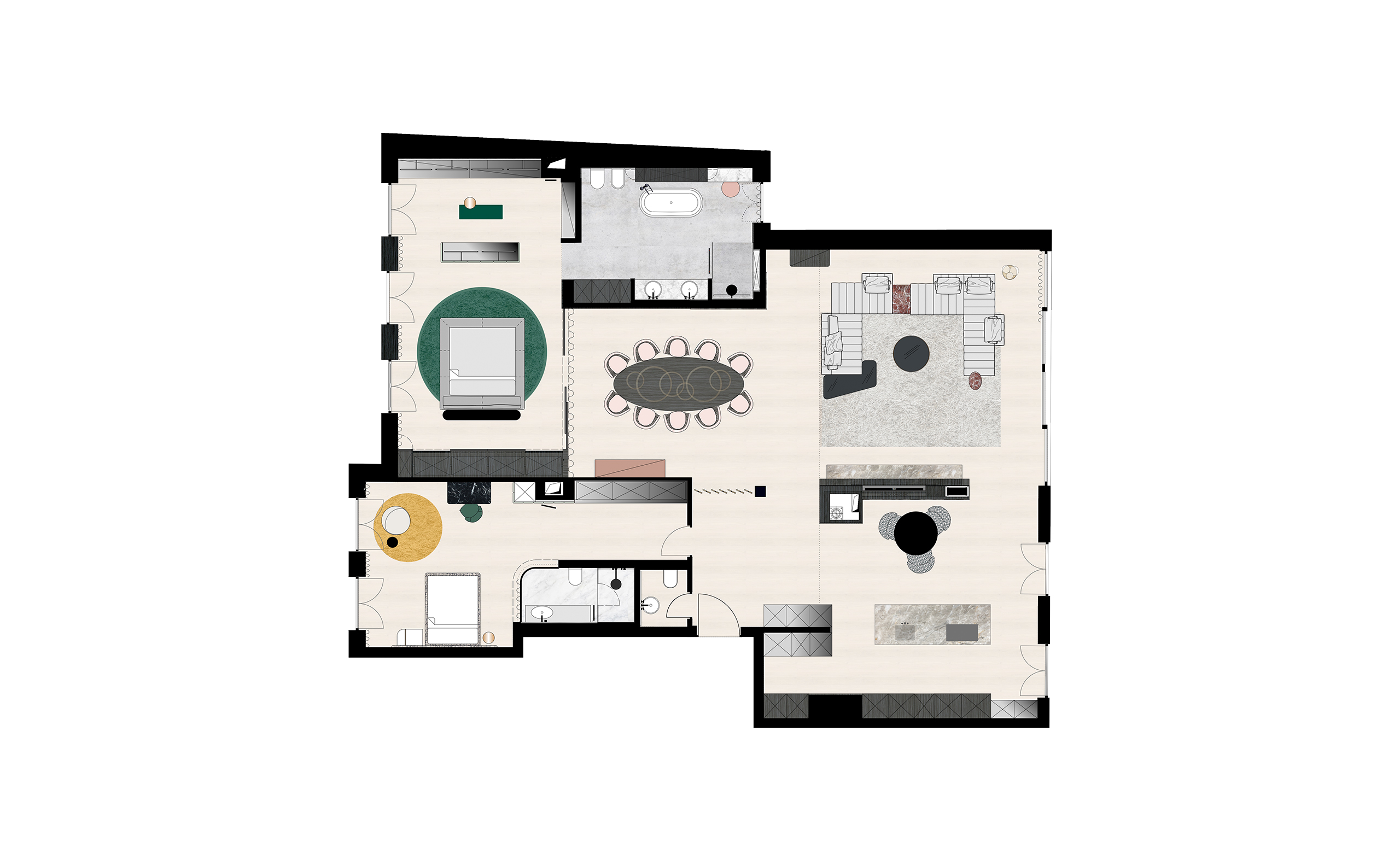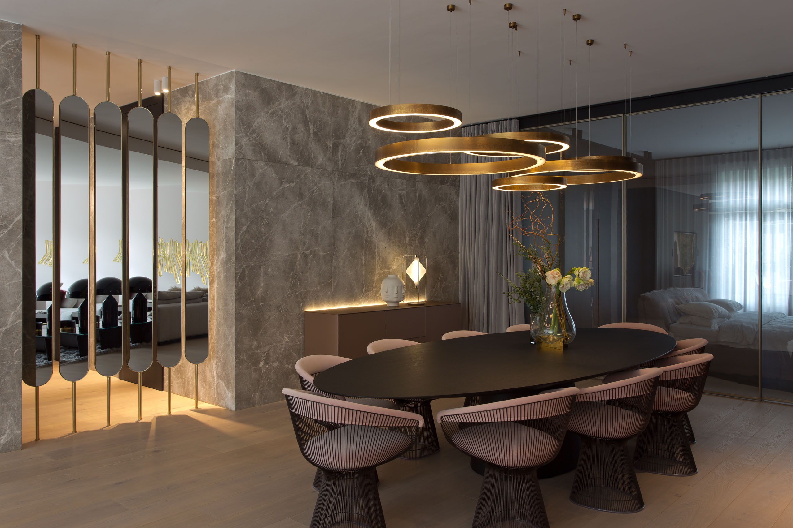 Durch die intelligente Umstrukturierung zu einem offenen Grundriss, entwickelt sich in dieser Frankfurter Immobilie Privatsphäre, ohne Bereiche vollständig von einander zu separieren. Großflächig mit Naturstein, Holz und Spiegeln verkleidete Wandflächen empfangen den Besucher und fungieren als verbindendes Gestaltungselement durch das gesamte Apartment.