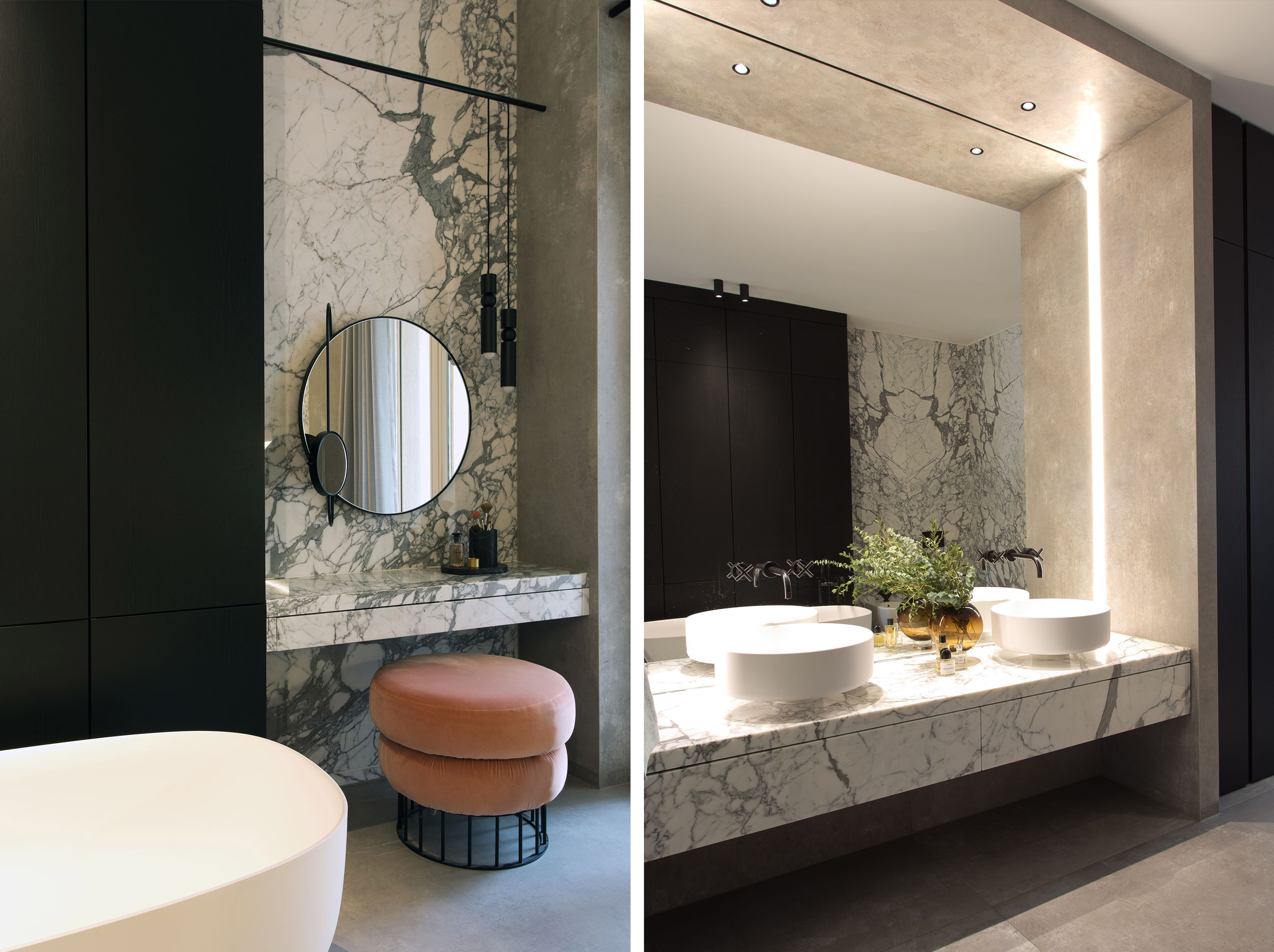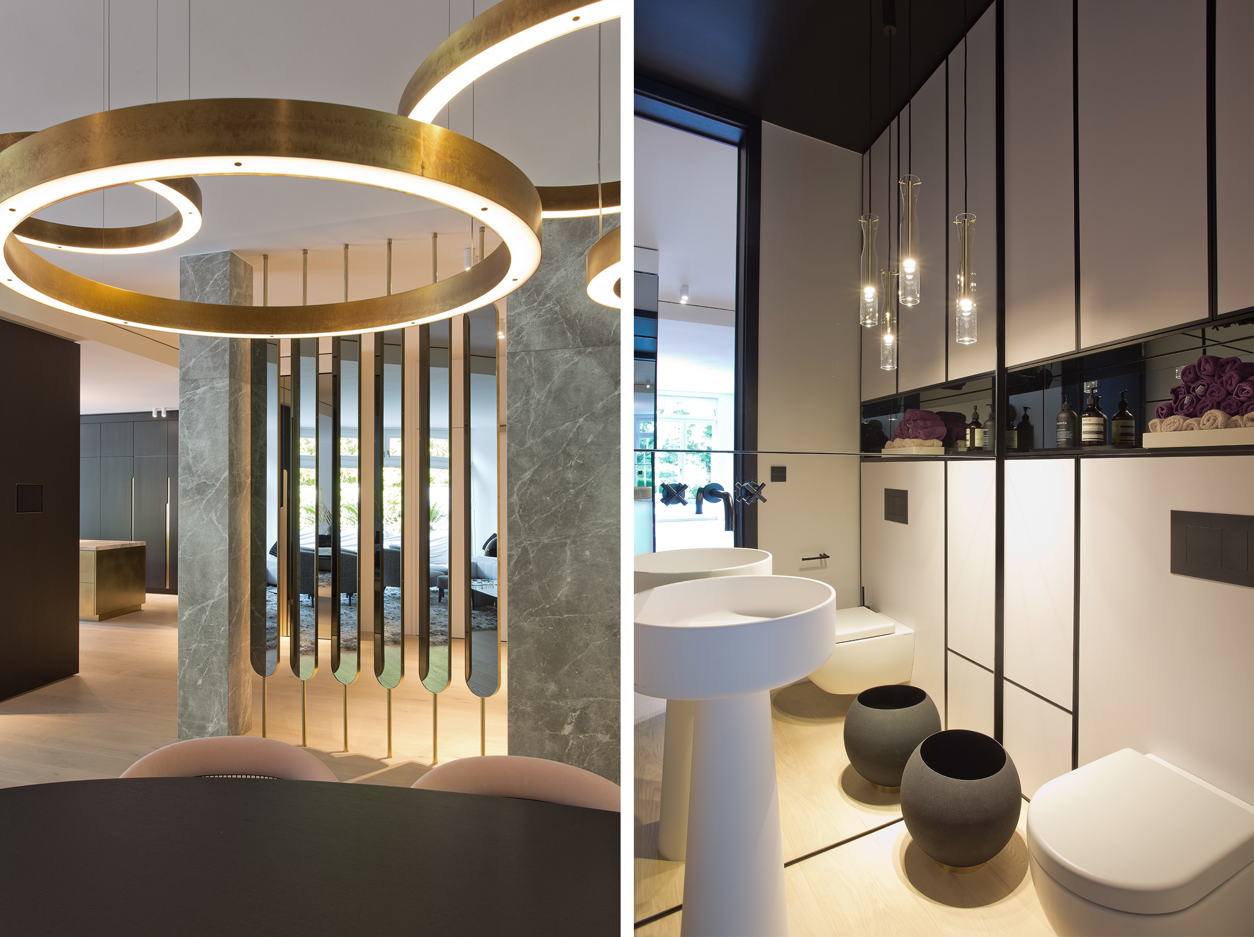 Der verwendete Marmor, die Details in Messing sowie der feinfühlige Umgang mit Farben, schaffen eine warme, eindrucksvolle Atmosphäre.