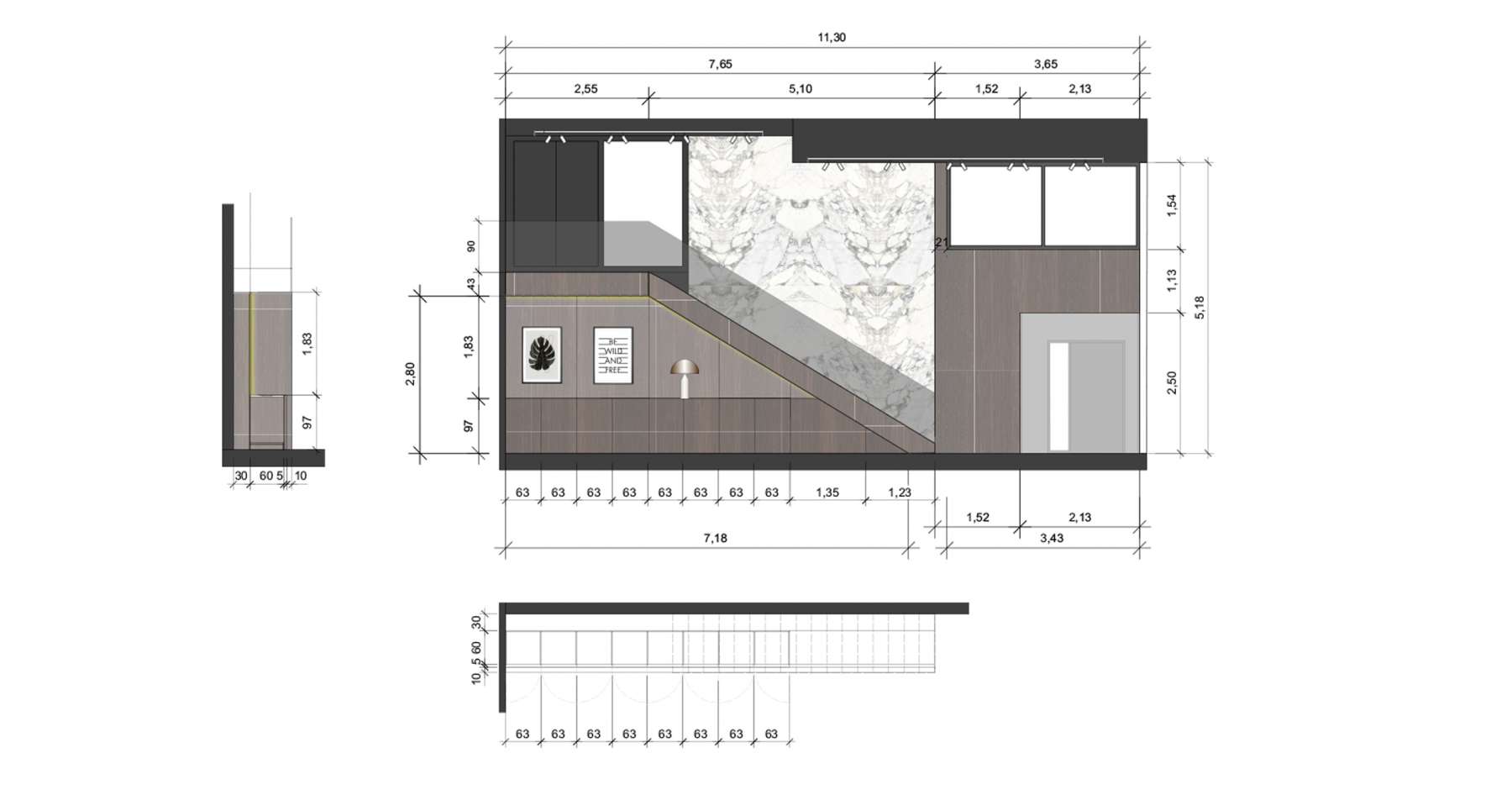 Eine lange Treppe ins obere Geschoss zieht sich wie eine Linie durch den Raum. Ein Mittelpunkt und gleichzeitig Gestaltungsmoment für die Frontwand. Die unterschiedlichen Materialien – Holz, Glas und Mamor – wirken wie dreidimensionale Schichten an der Wand und fügen sich zu einem harmonischen Gesamtbild zusammen. Sie ziehen sich wie ein Ader durch alle Räume.
