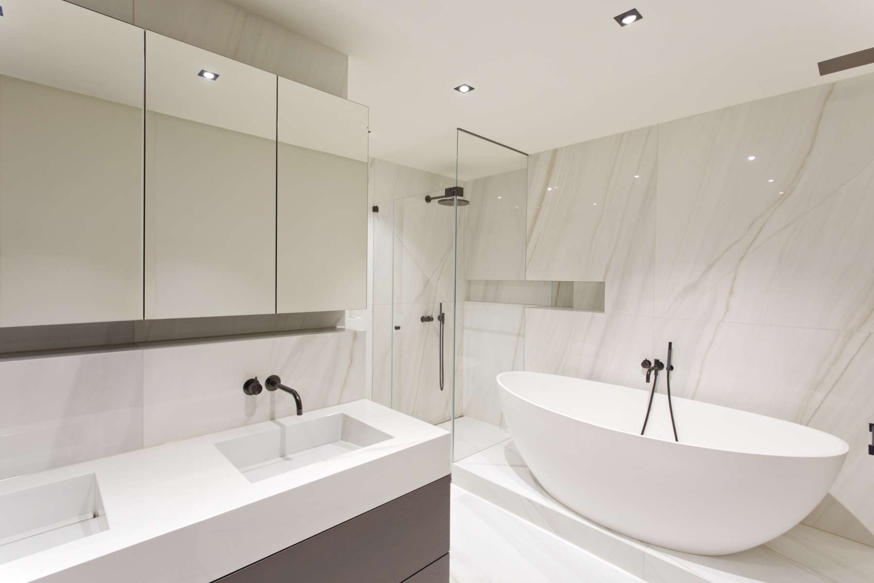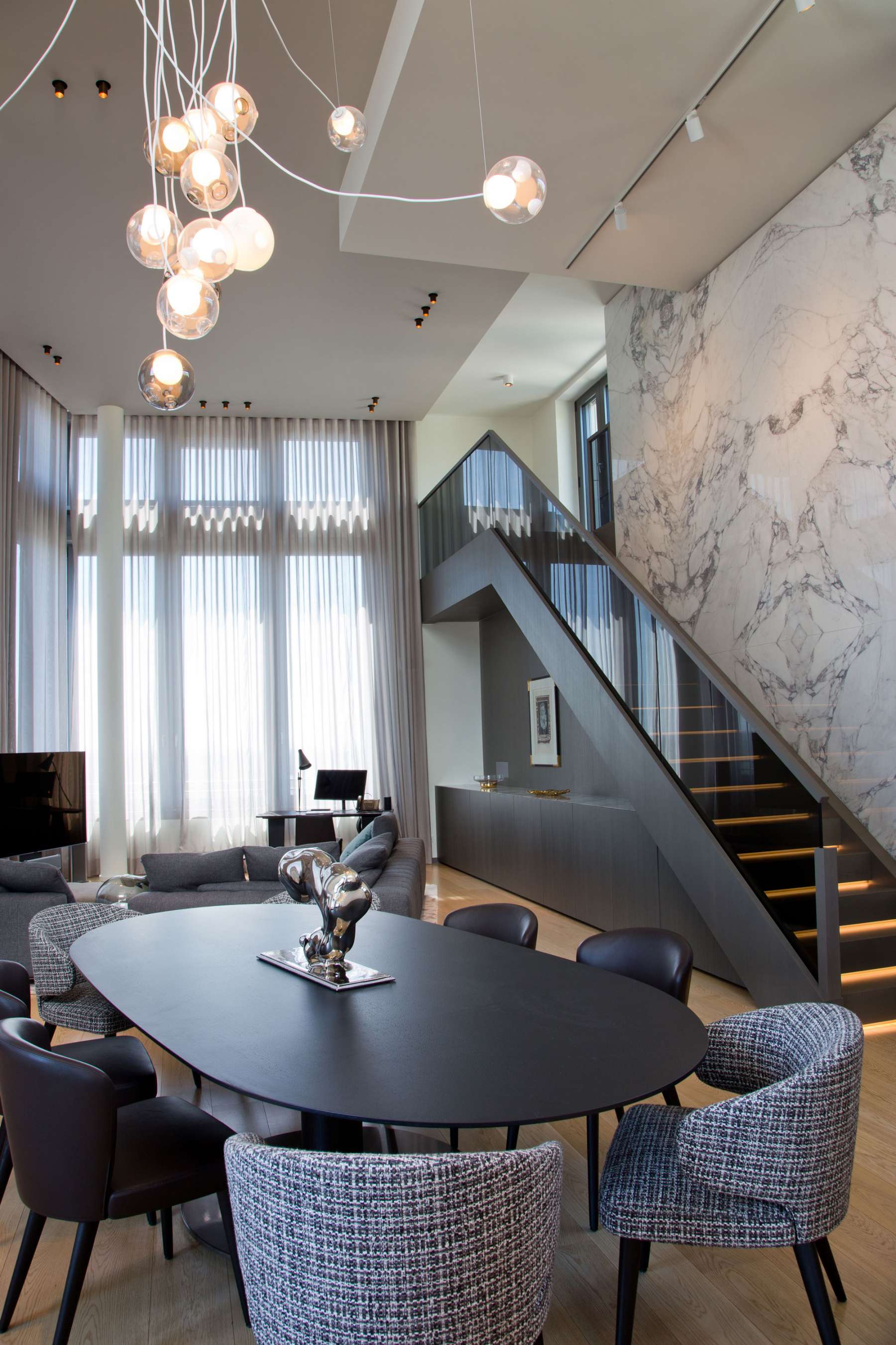 Die Wand ist auch gleichzeitig Funktionselement für Stauraum mit integriertem Sideboard. Eine zweite Decke zieht sich wie eine zweite Gesteinsschicht in der Marmorwand der Treppe. Im Essraum suggerieren viele Lichtkugeln über den Tisch eine zweite Decke im Raum. Alle Gestaltungselemente sind Rückhalt gegenüber der Offenheit der Fensterfront. Diese wird umsäumt von einer umlaufenden Terrasse. Eine Kleinoase, parkähnlich – und im Sommer ein zweiter Lebensraum.