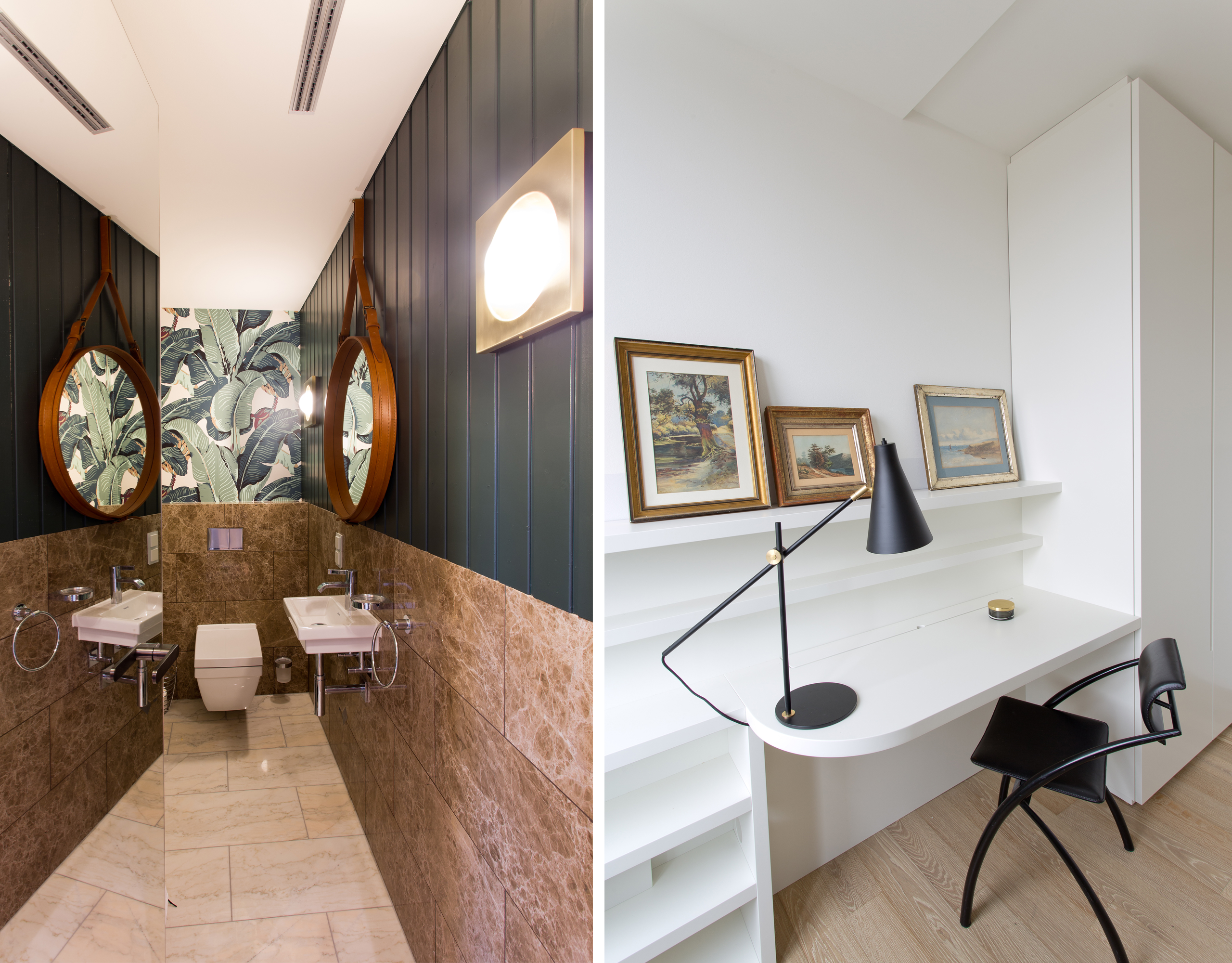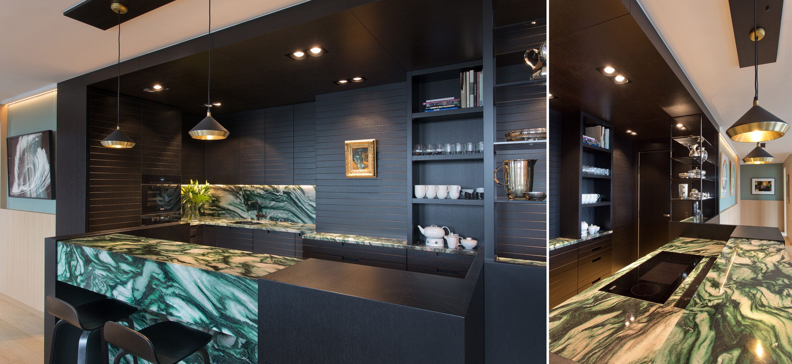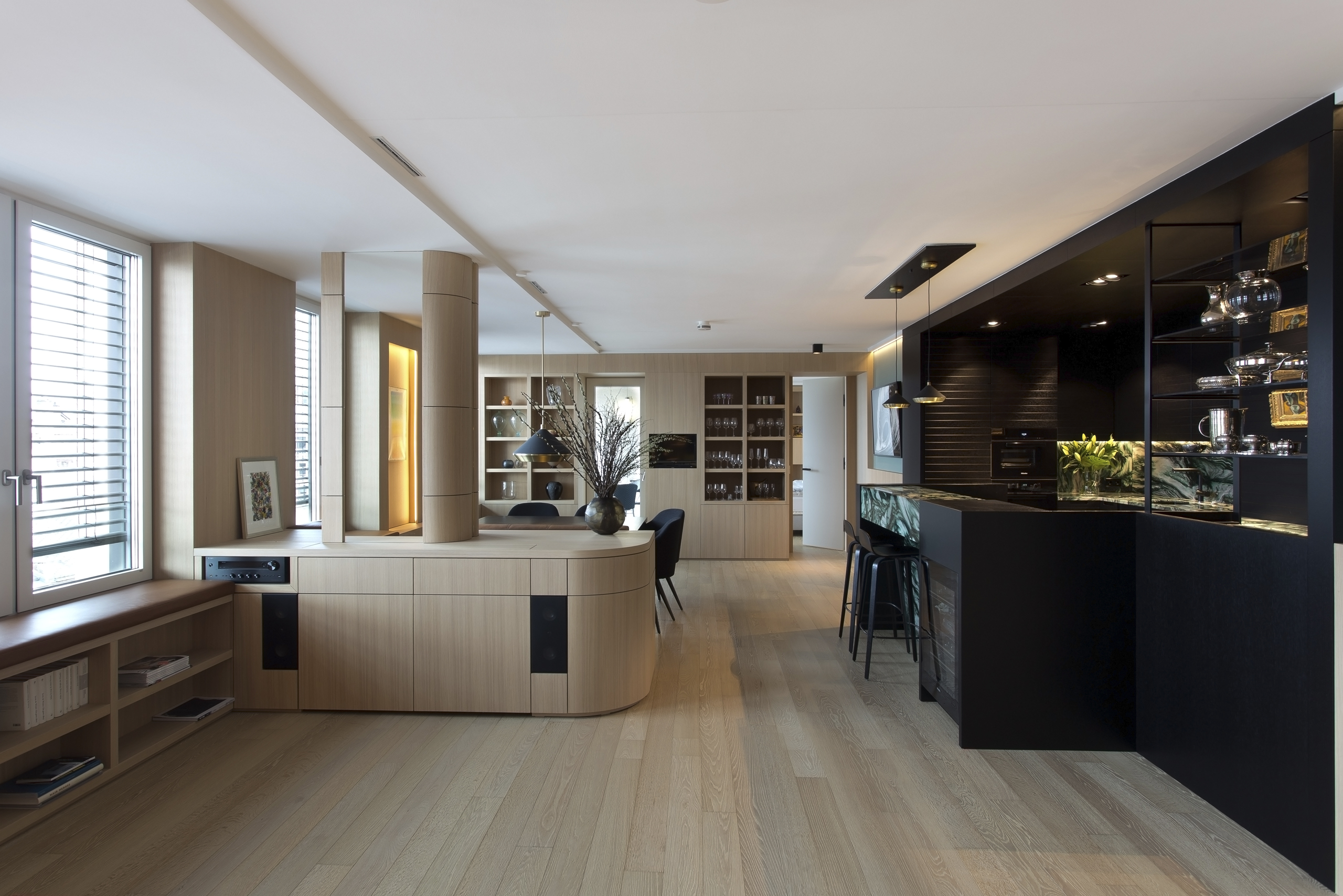 Das Herz des Projektes ist die individuell gestaltete Küche, als Blackbox wie ein Fels im Raum. Sie gliedert in Ihre Dunkelheit das Leben Wohnen und Arbeiten gezielt bewusst und provozierend. So teilt sich die Wohnung wie selbstverständlich in ihren eigenen Materialien in Hell und Dunkel.