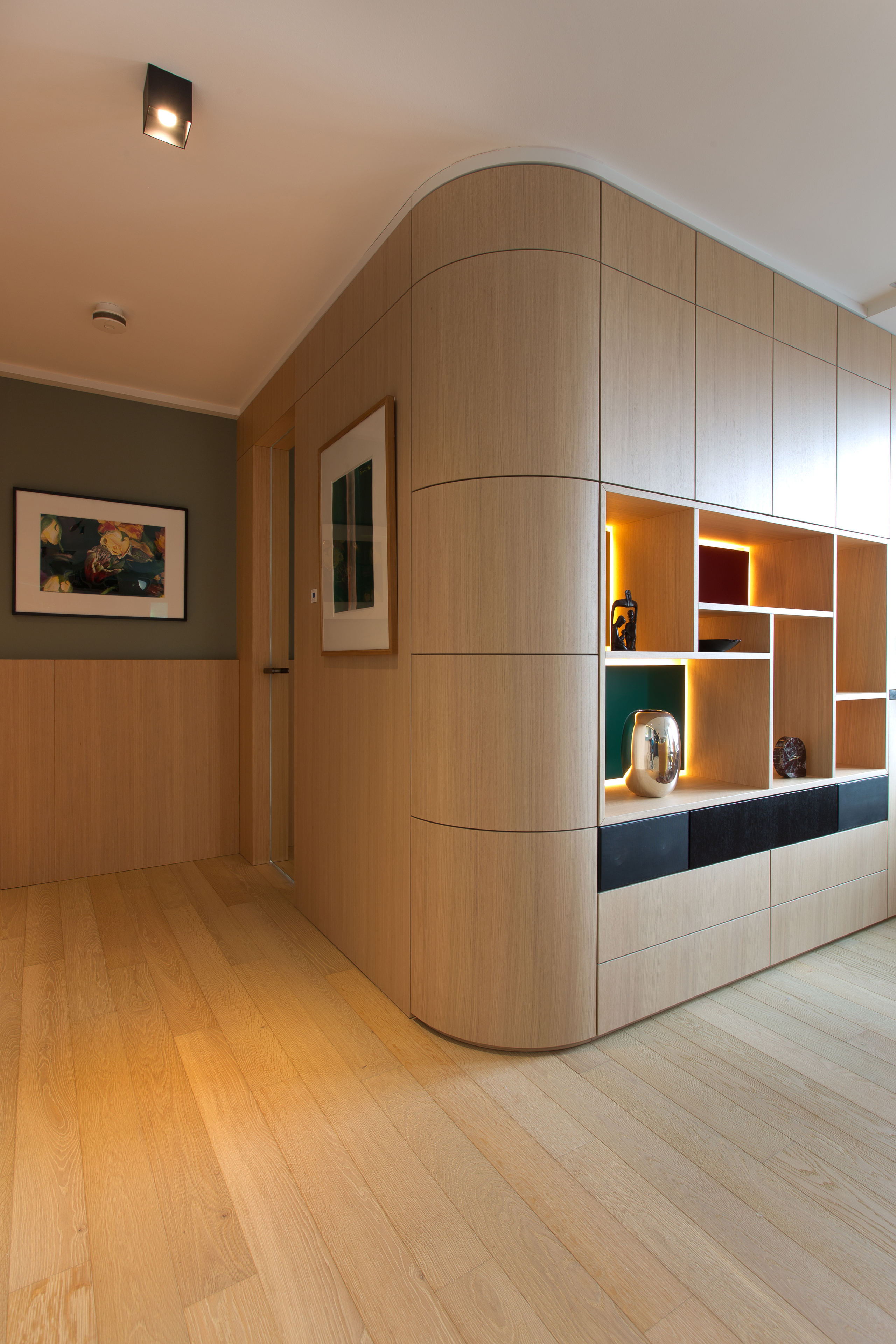 Die Kunst ist der Hauptakteur. Mit einer Vorliebe zum Allgäu wurden natürliche Materialien wie Holzpaneele an den Wänden platziert und verarbeitet. Die Kunst wirkt wie selbstverständlich und rahmt den Raum ein.