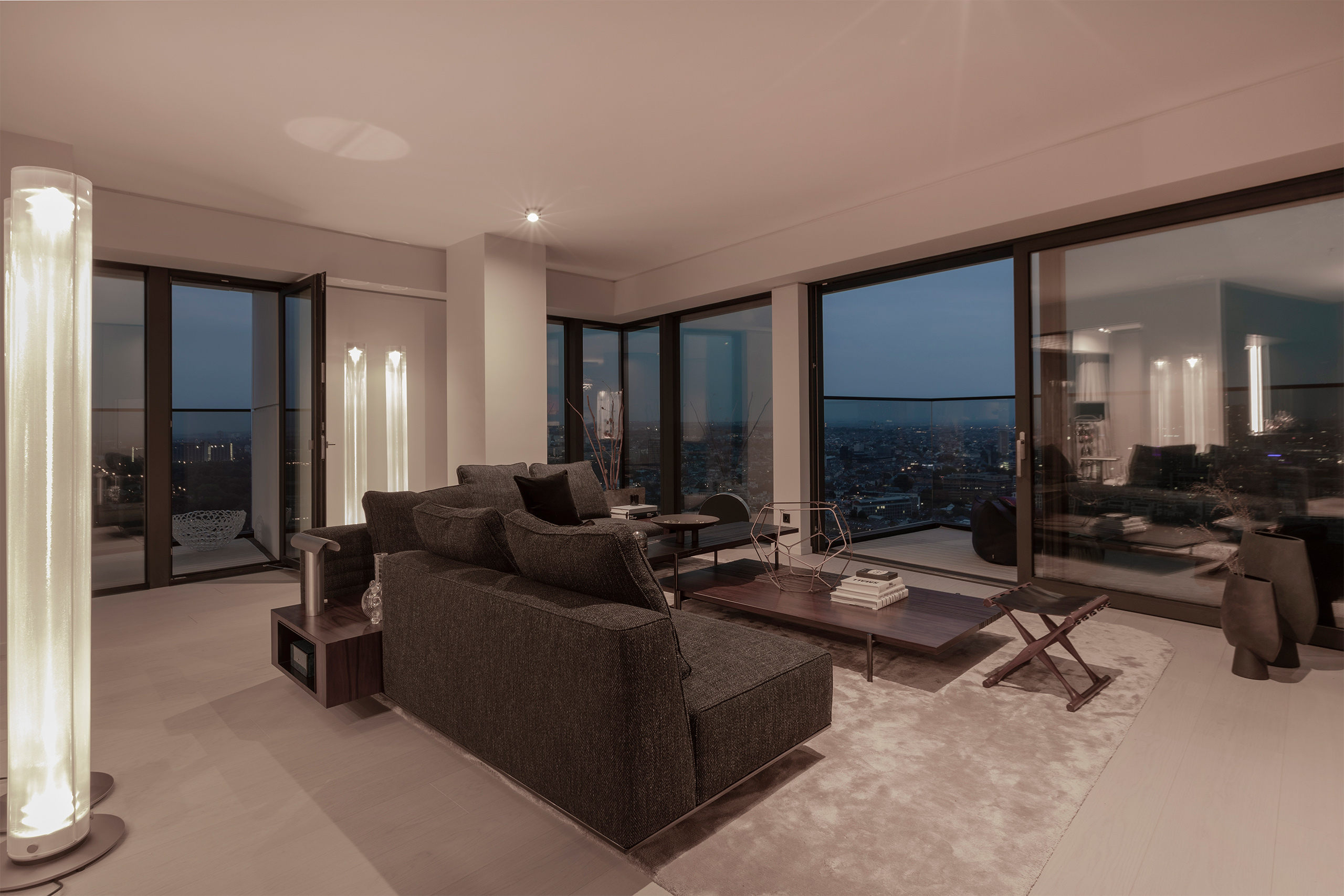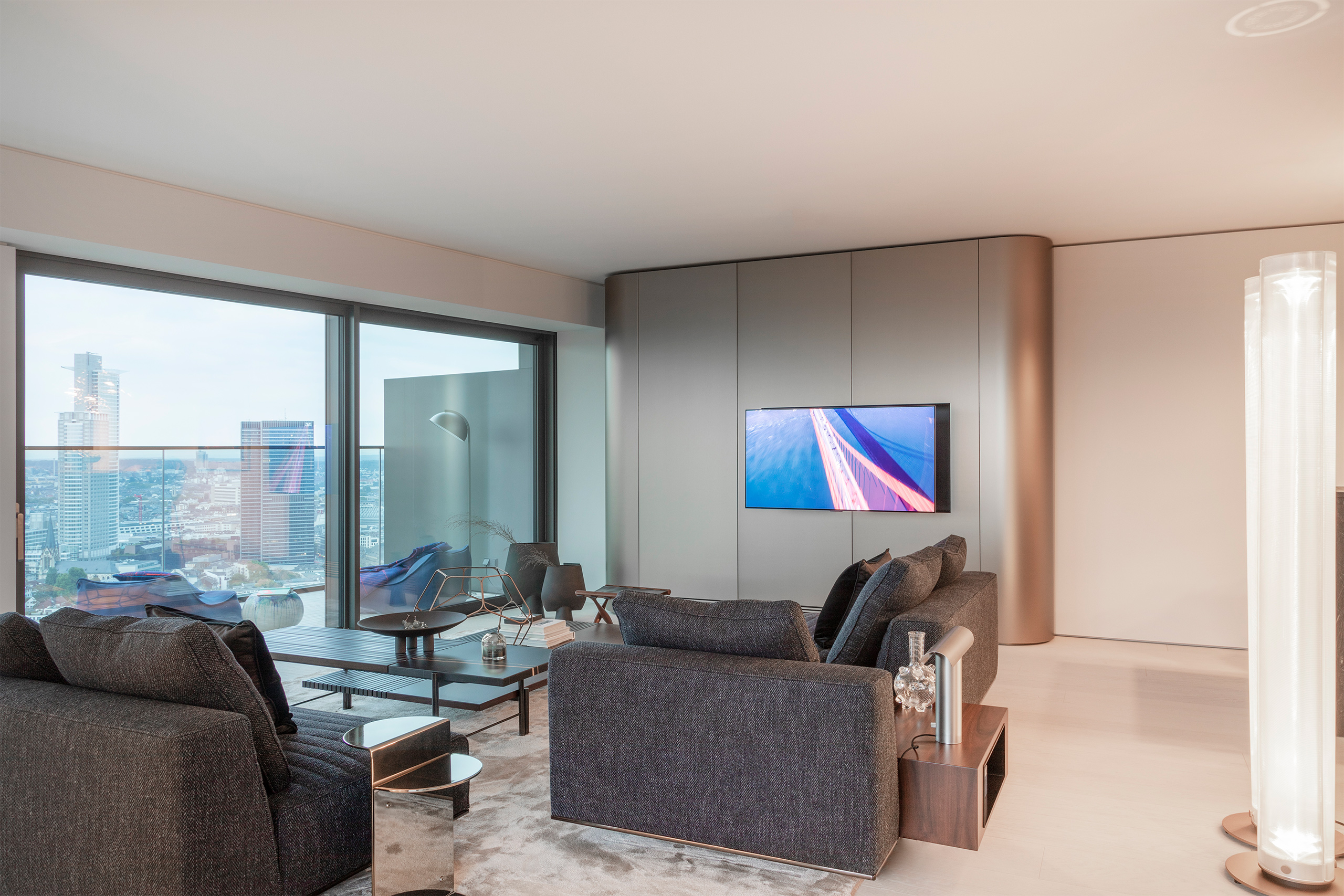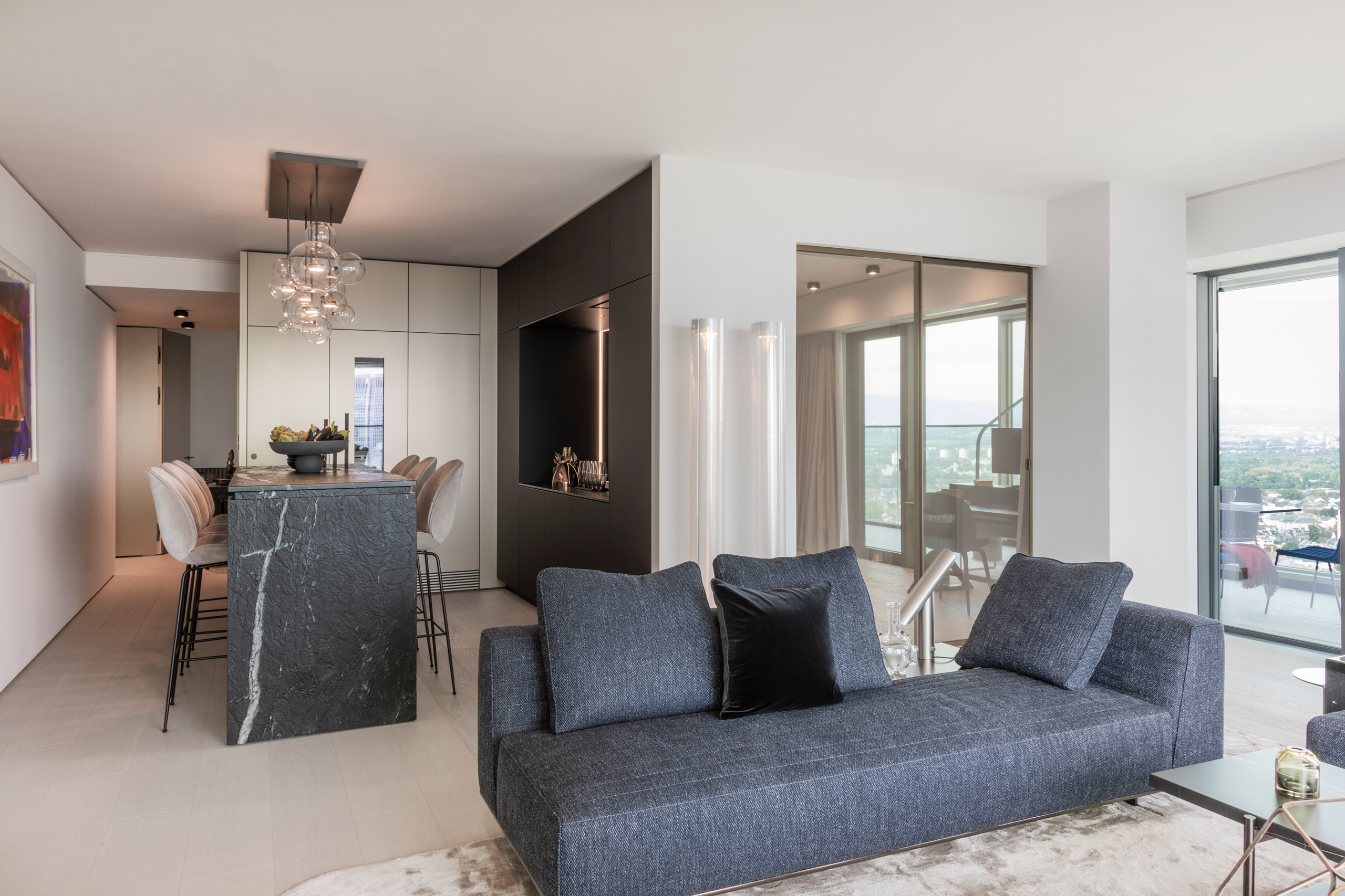 Im neuen Highlight Frankfurts, dem hybriden Wohnhochhaus OneFortyWest, entstand im 32. Stock ein minimalistisches Wohnjuwel auf 133 Quadratmetern. Hierbei standen die Schlagworte: Eleganz, fließendes Raumkonzept, Funktionalität verpackt in einem eleganten Oberflächenkonzept, Formalität gepaart mit Gefühl, kontrastreich, skulptural, Pate.