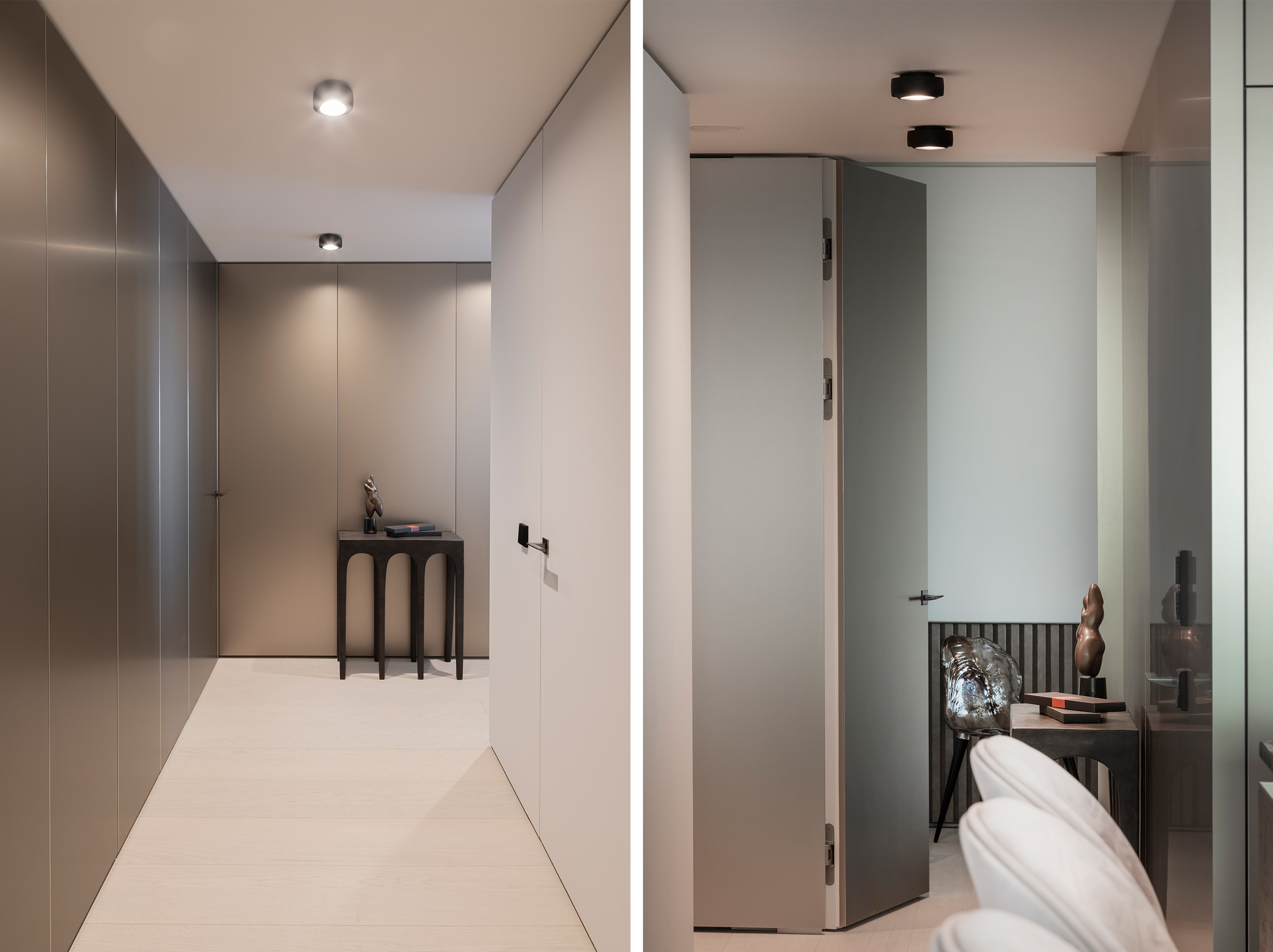 Der Bauherr wünschte sich einen individuell designten Rückzugsort über den Dächern der Frankfurter Metropole, der sich deutlich vom Standard des Towers unterscheidet. Ziel war ein eleganter Innenausbau, mit fließendem Raumgefüge. So wurden Wände und eigens designte Einbauten mit eloxiertem Aluminium, Fenix oder gestrichenen Vorsatzschalen verkleidet, die ein extrem großzügiges Raumgefühl schaffen. Diese eleganten Wandverkleidungen empfangen den Besucher im Entrée, umkleiden Sockelleisten, lassen Türzargen verschwinden, umhüllen den Schuhschrank und ziehen sich bis zum Hauswirtschaftsraum. Diese Oberfläche findet sich auch im Küchenbereich mit integriertem Weinschrank und zusätzlichem Stauraum und paart somit Eleganz mit Funktionalität.