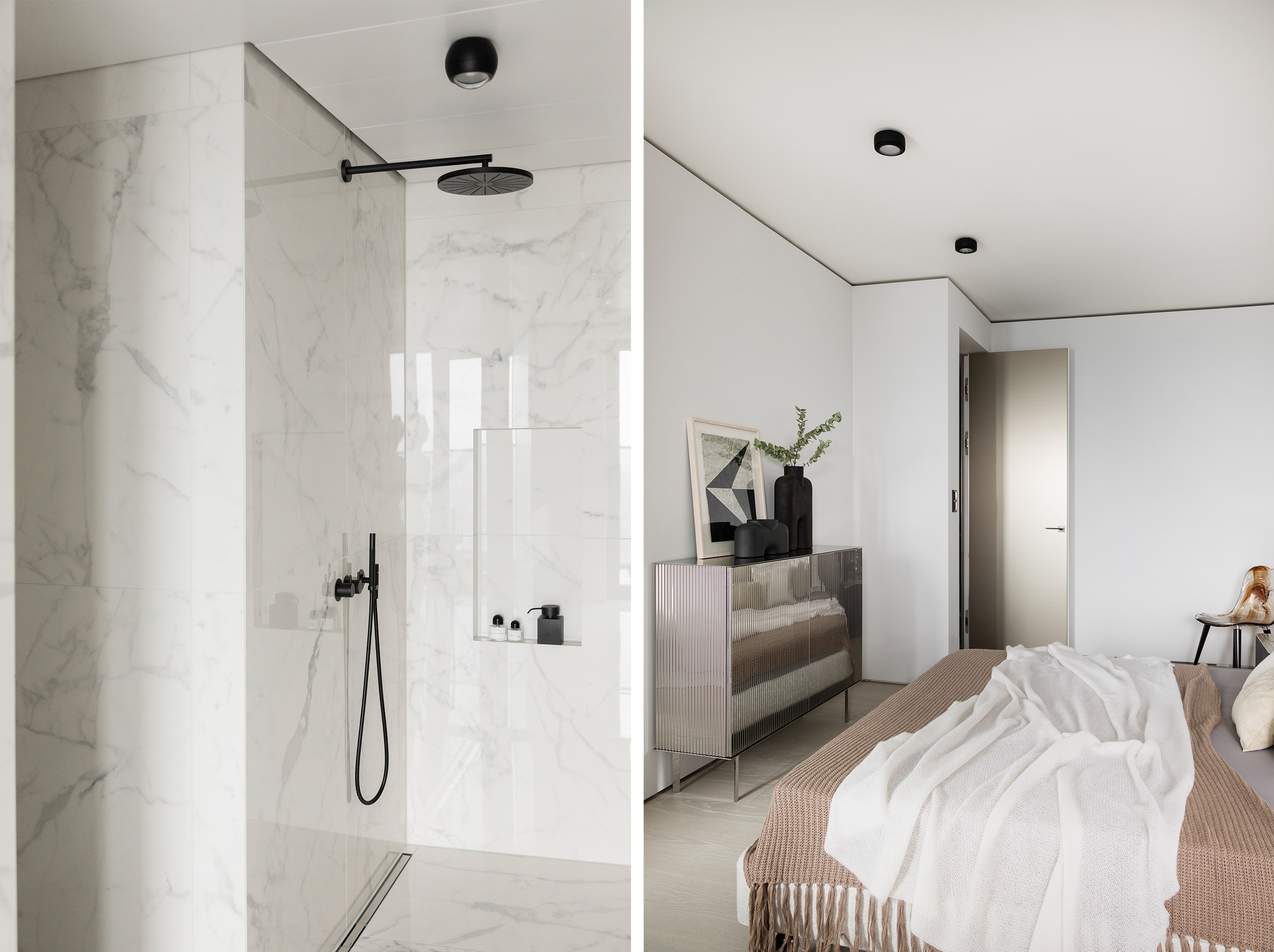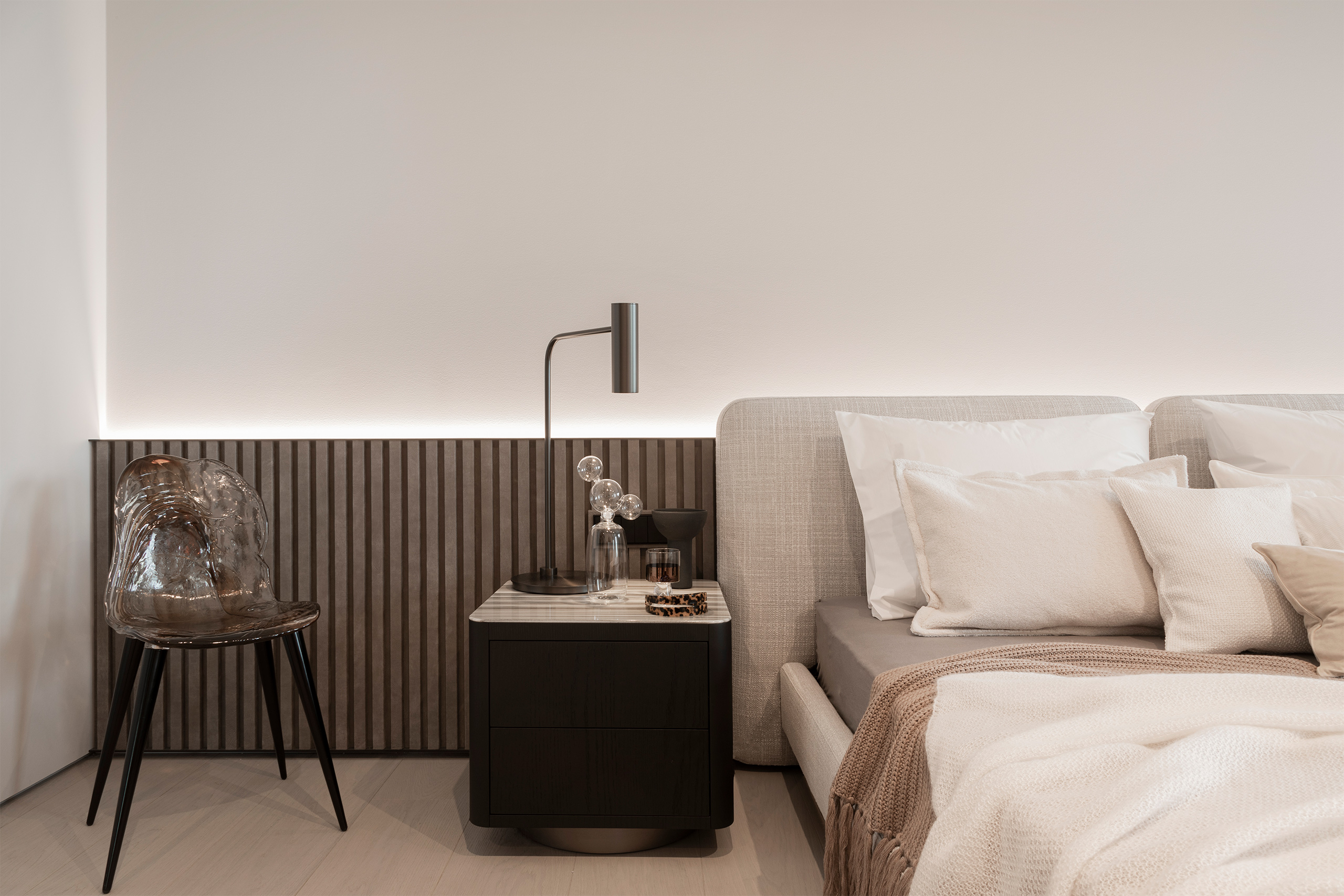 Die Wandverschalungen ziehen sich bis in den Schlafbereich und schaffen somit ein einzigartiges, großzügiges Raumgefühl in der gesamten Wohnung.