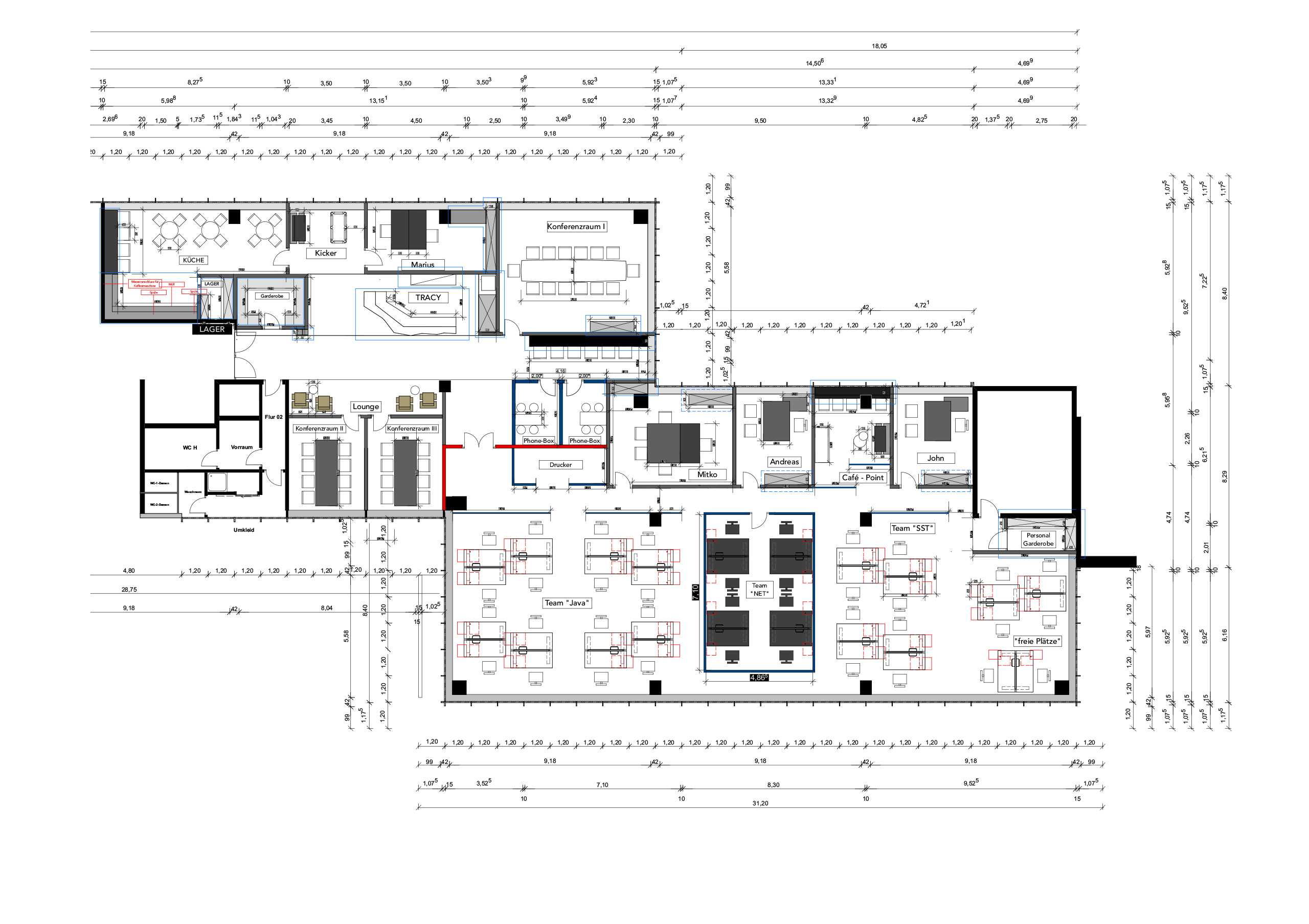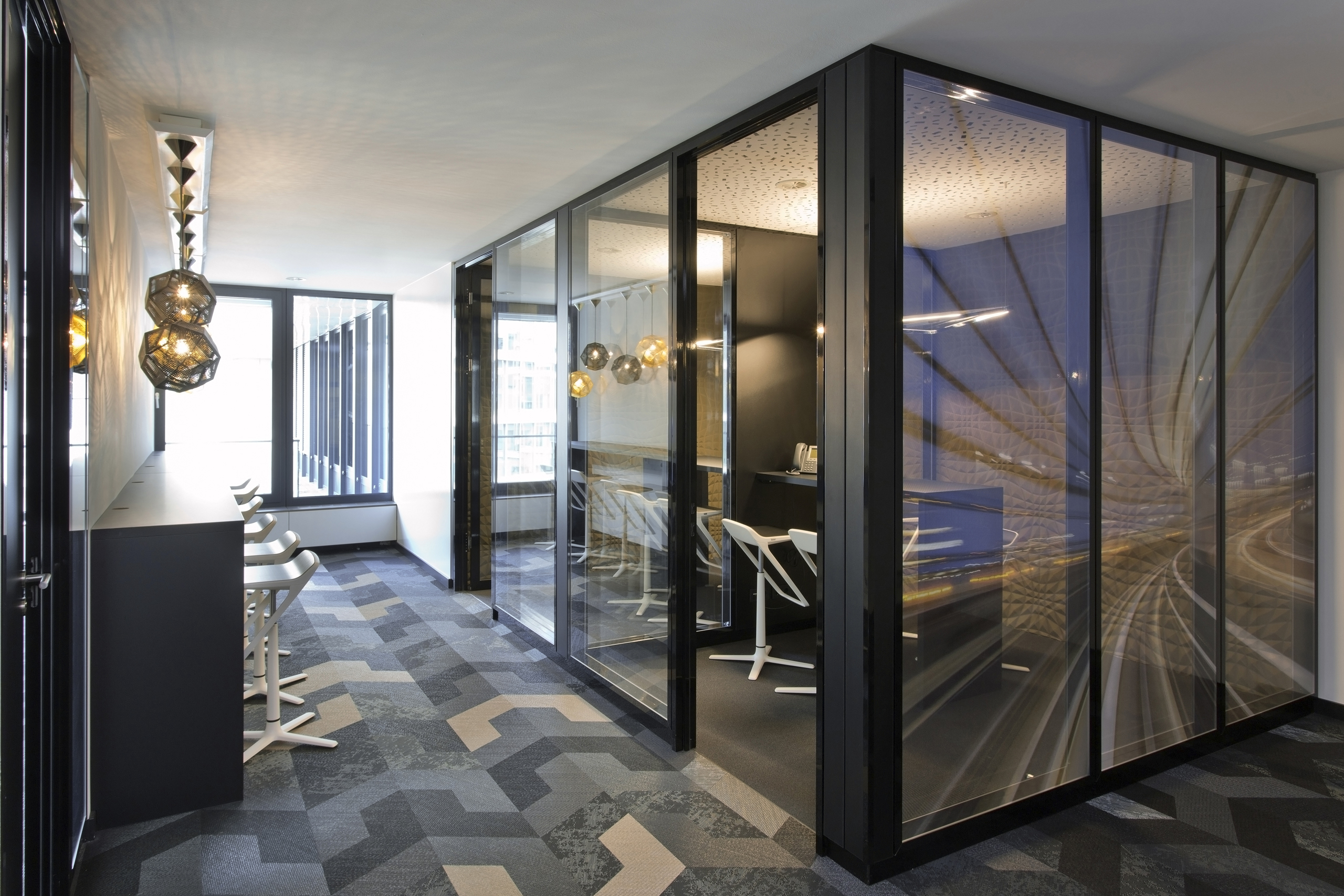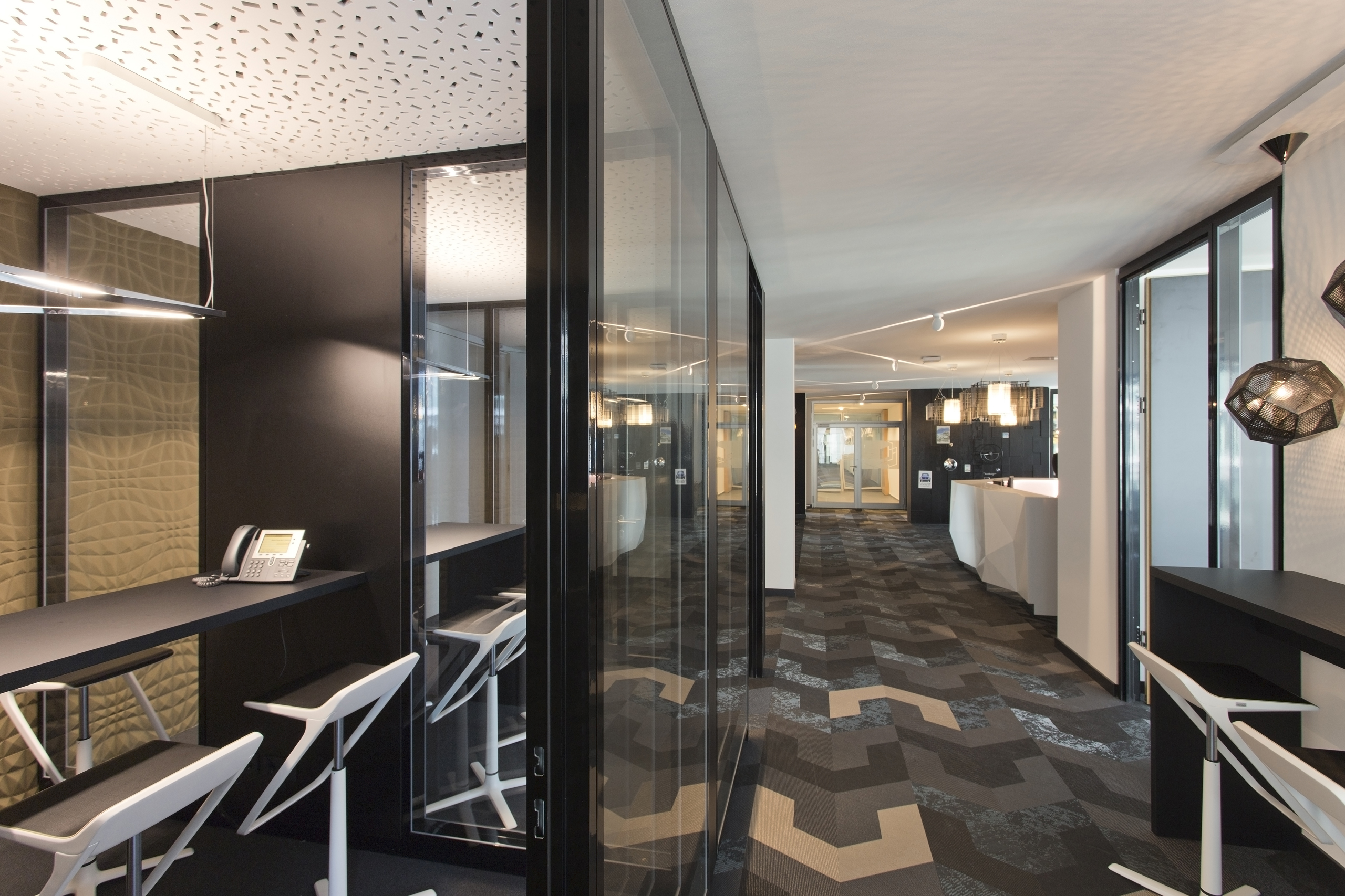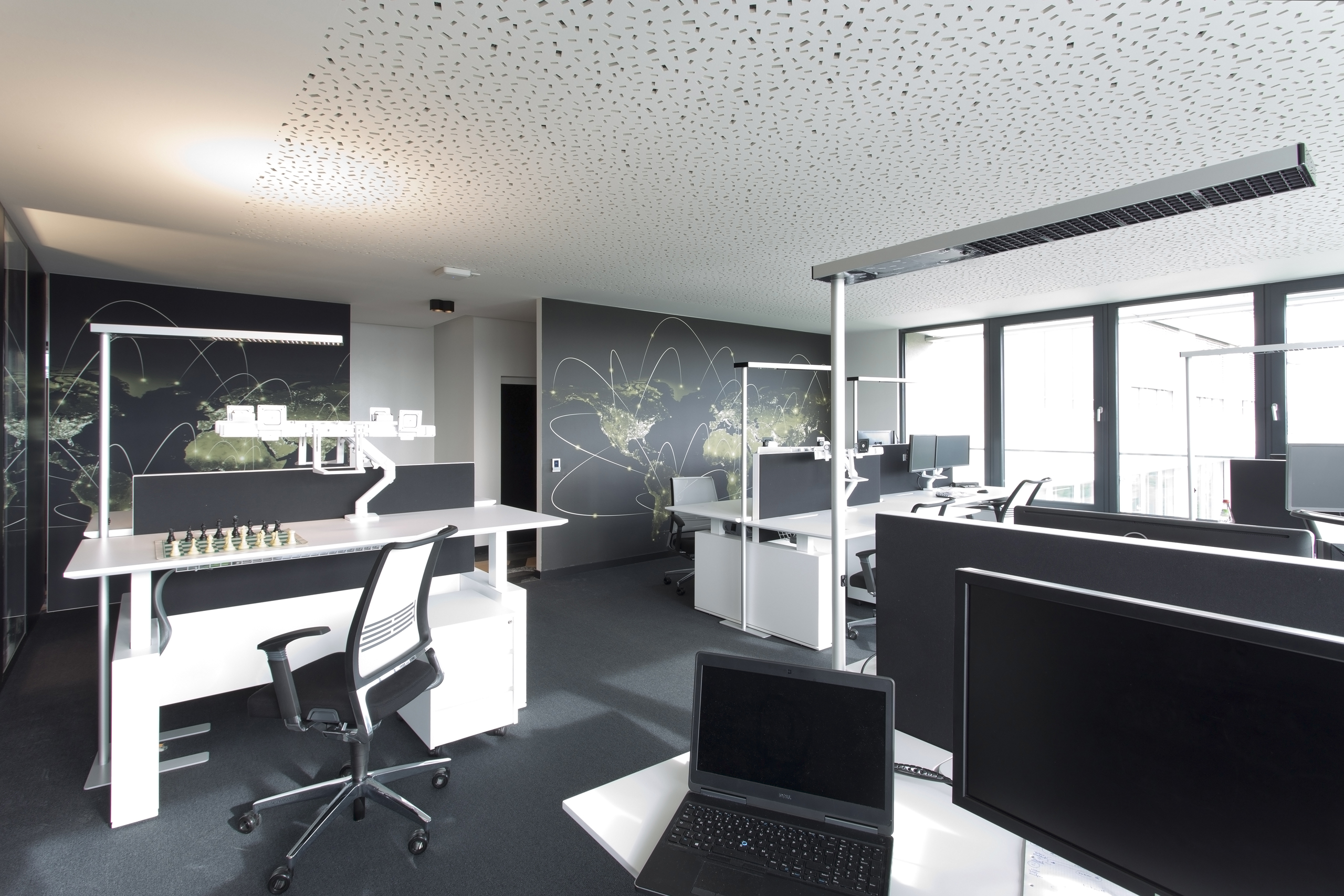 Eigens entwickelte höhenverstellbare Schreibtische erleichtern die Arbeit und bieten nach den Arbeitsstättenrichtlinien den Mitarbeitern ein gesundes, körpergerechtes Arbeiten. Technik auf aktuellstem Stand. Zellenbüros aber auch Open Space Areas unterbrochen mit Glasboxen, hoch technisch ausgerüsteten Konferenzräumen, sowie Coffee Vending Points bieten ein buntes Raumgefüge für zeitgerechtes, entspanntes und teamorientiertes Arbeiten.