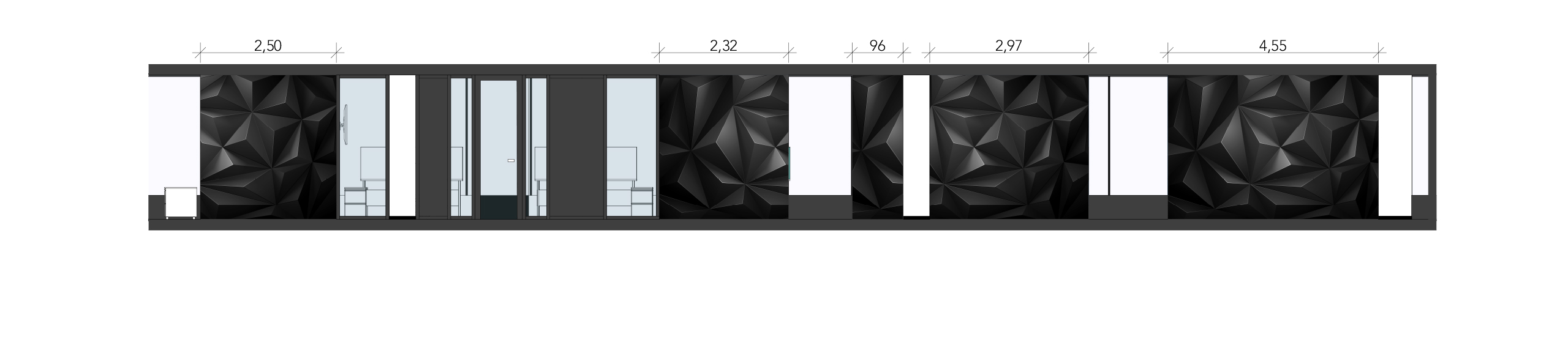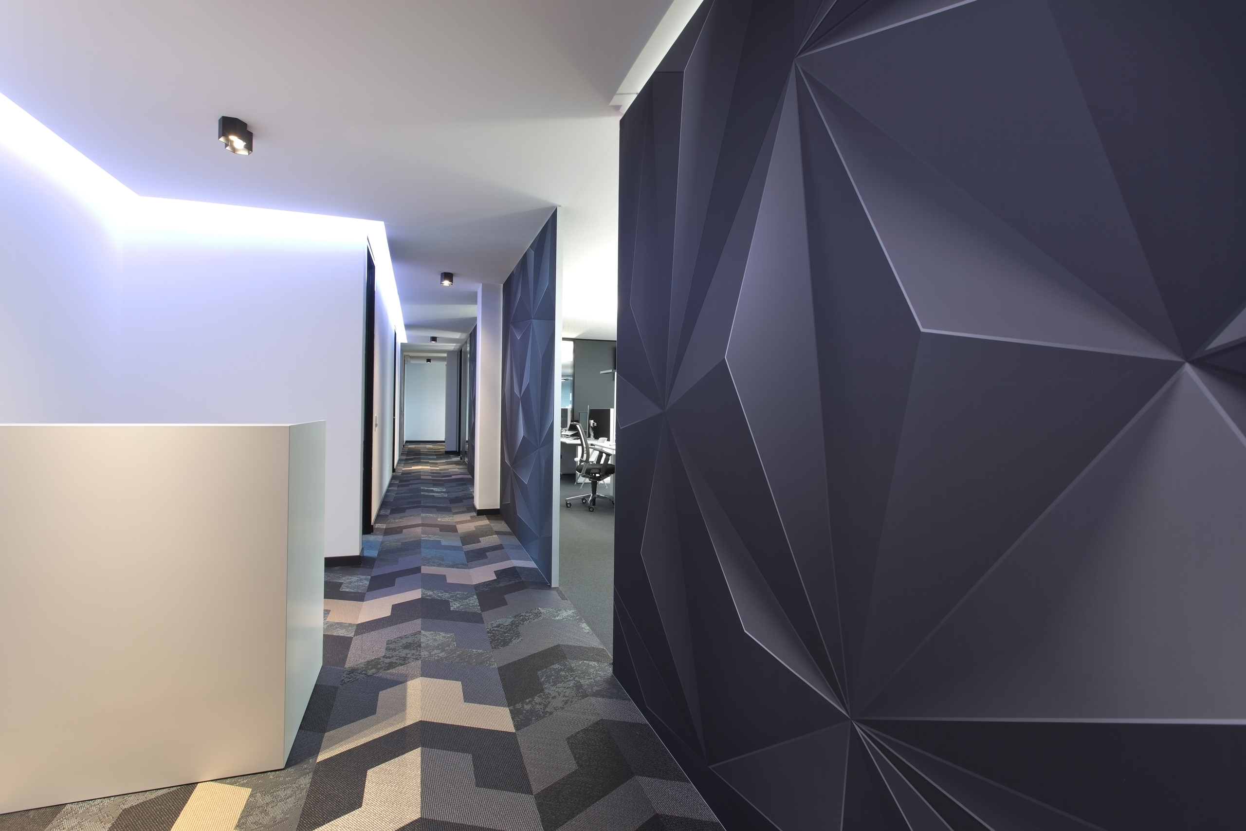 Die Vorabanalyse neuer Bürostrukturen unter Einbeziehung der verschiedenen Arbeitsprozesse, reflektieren ein schlüssiges einzigartiges neues Bürokonzept. Der aus Dreiecksfacetten dreidimensionale reinweiße Empfangstresen sieht aus wie ein spaciges Raumgefährt. Dazu bilden 360° Laserlampen scharfe Linien an der Decke.