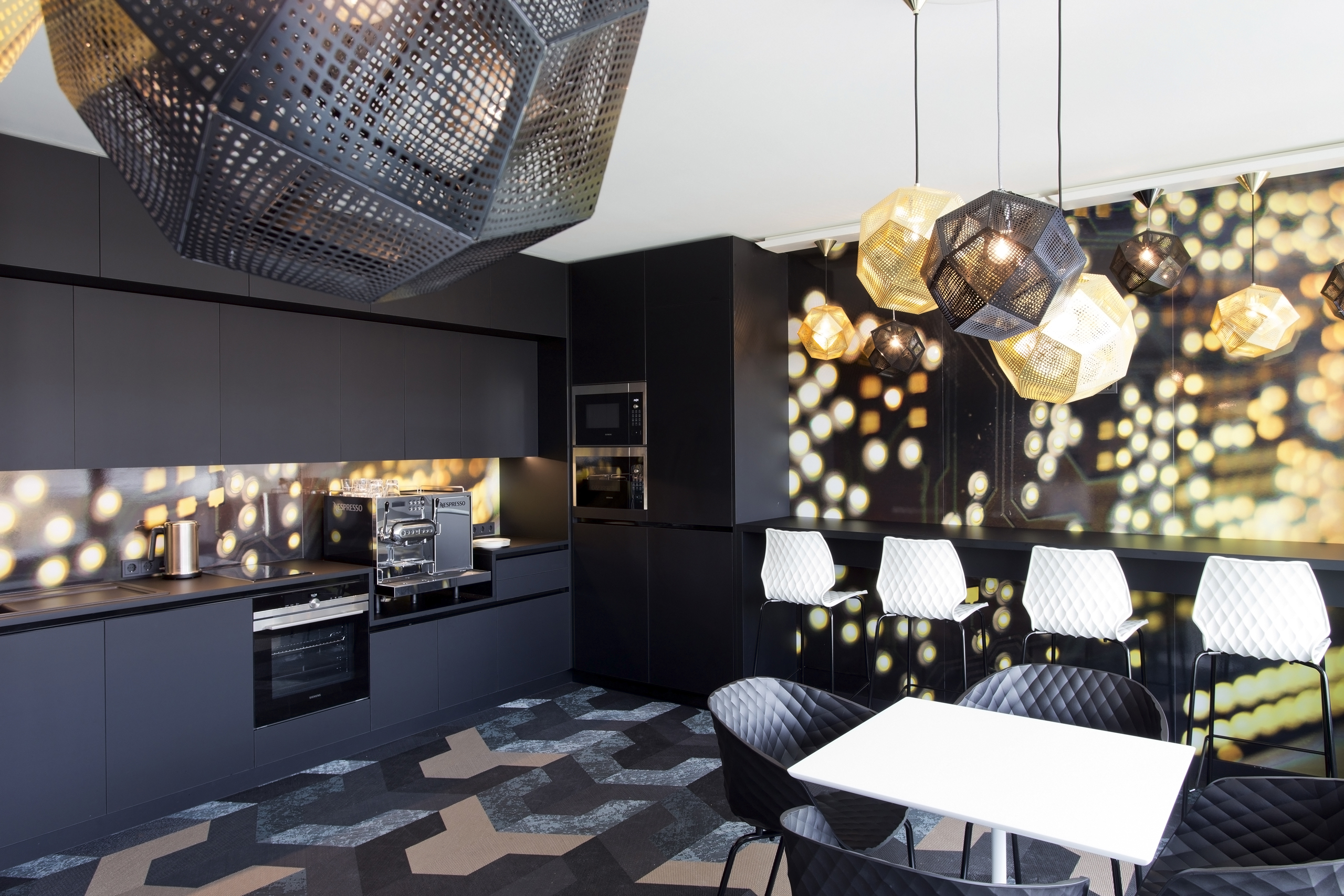 Das ganze Beleuchtungskonzept ist metallen mit Strukturen, die das Licht phantastisch brechen und interessante Muster an die Wände strahlen. Die Sofas sind mit Hightech Stoffen bezogen.Der Boden ist, mit seinem verschiedenfarbenen Diagonalsegmenten, Plattform für diese neue ungewöhnliche inspirative Bürowelt. Im Sinne des Fortschrittes wurden, dem Brand von Urban Science entsprechend, in jedem Raum Akustikpaneele oder Wände mit futuristisch technischen Motive ausgesucht und in Szene gesetzt. Selbst an der Küchenfront erstrahlt in warmen Farben eine vergrösserte Computergrafikkarte und Platinen, die die Vernetzung zur Außenwelt darstellen. Speziell entwickelte Akustik-Phoneboxen in der Konferenzzone sollten Abwechslung und zugleich Rückzug ermöglichen.