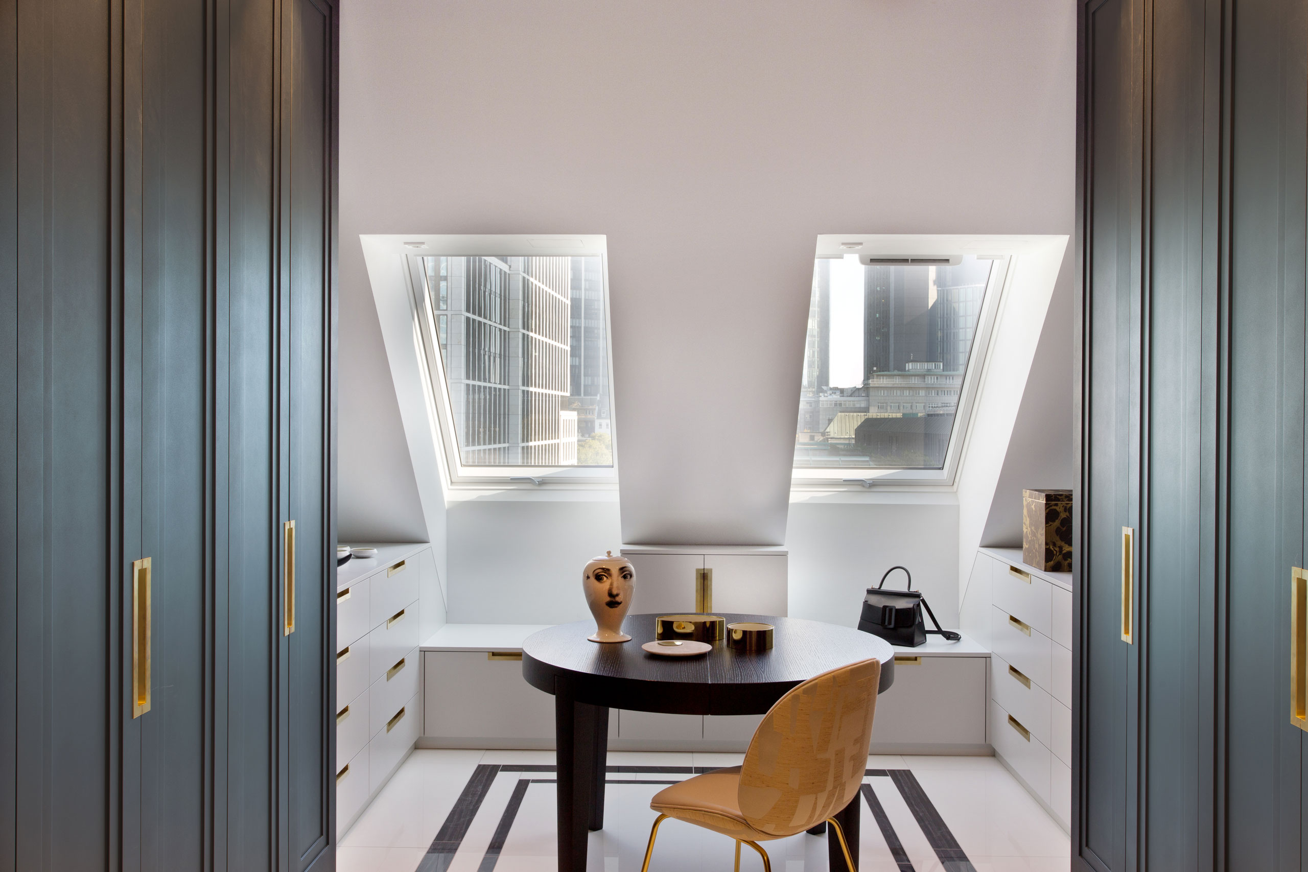 Beim Eintritt in die Wohnung öffnet sich der Lounge Bereich majestätisch zur Skyline, eingebettet in den schwarz-weiß gestalteten Marmorboden. Er spiegelt das Licht und inszeniert die Möbel strahlend und hell erleuchtet.