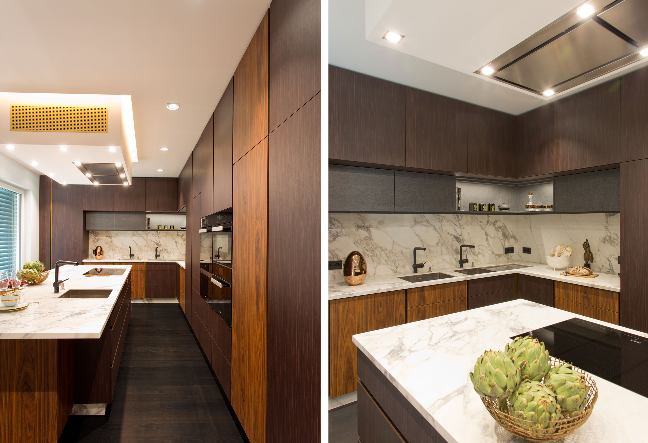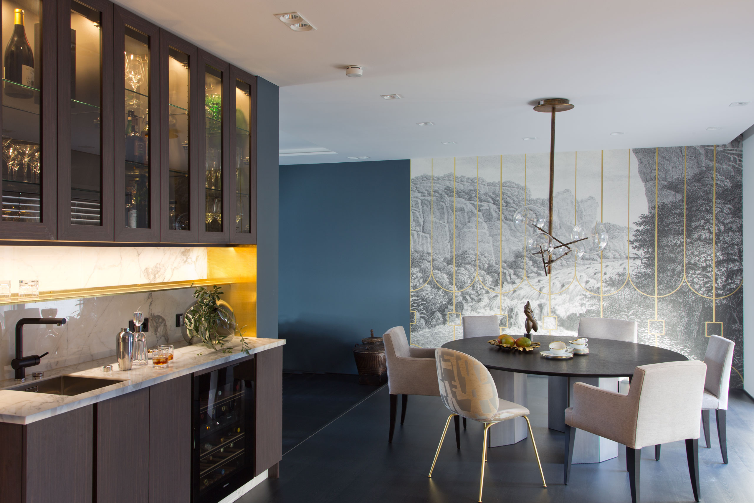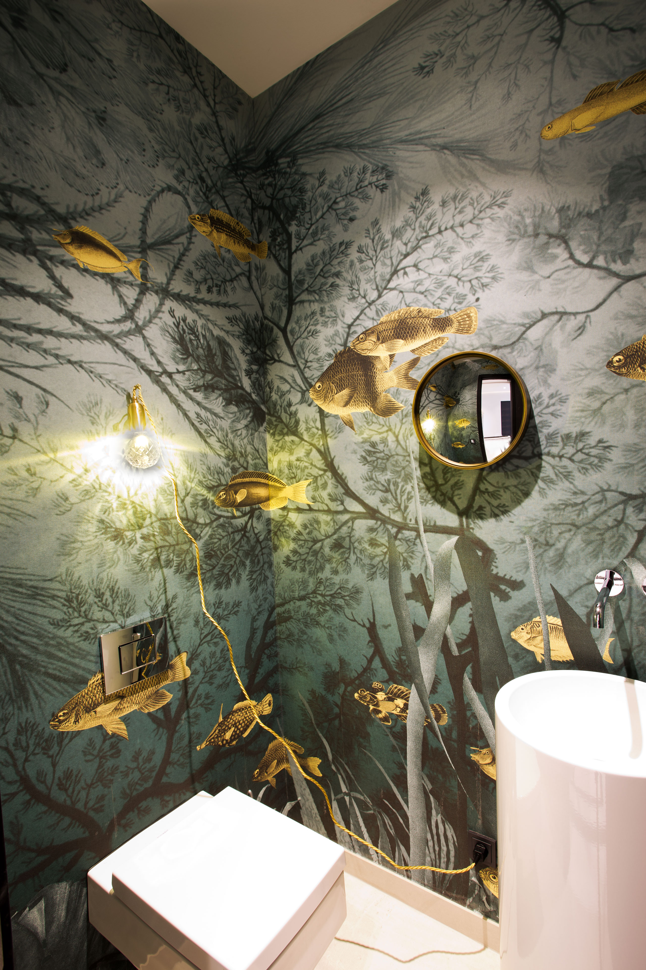 Wie an einer Kette gezogen erschließt der Flur Raum für Raum, mit einzelnen Highlights unterstützt, unterstützt durch ein wechselndes Lichtkonzept. Im Gäste-WC schwimmen goldene Fische fast schon dreidimensional für den Betrachter in den Raum. Das Esszimmer wirkt morbid, man lebt und sitzt in einer Landschaft, Natur pur, angrenzend an das türkisfarbene Wohnzimmer, bewusst dunkel gestaltet. Die funktionale Küche, Mittelpunkt der Familie, ist eine Herausforderung für den Betrachter.