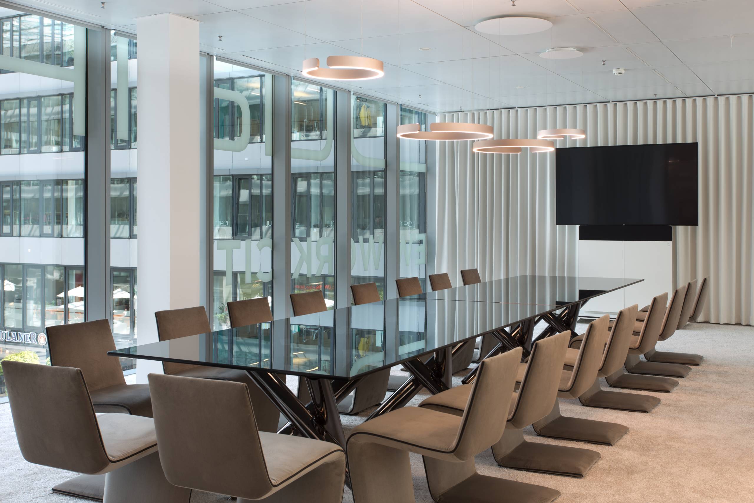 Auf 230 qm bietet diese Marketing-Suite am Frankfurter Flughafen einen Ort für Meetings in exklusiver Atmosphäre. Der lichtdurchflutete Raum besticht durch sein helles, einladendes Interior. Der hochwertige Teppich durchzieht